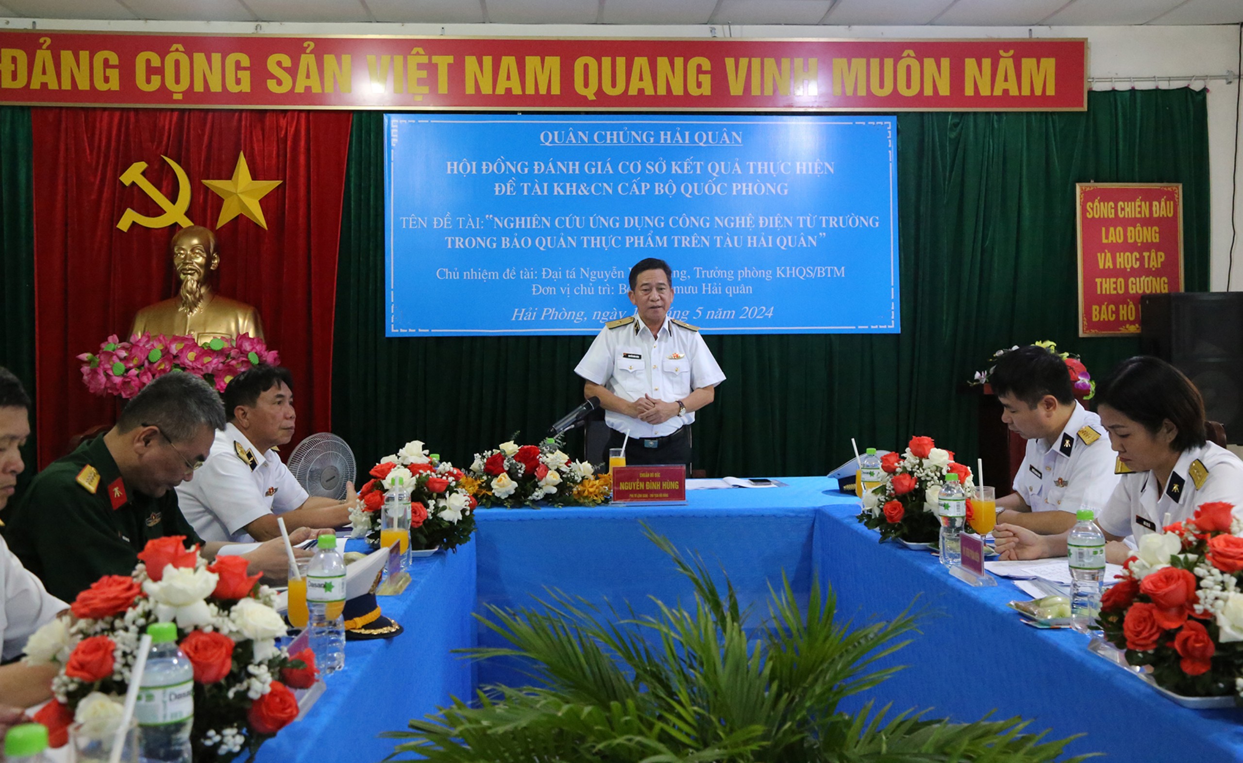 Chiều 13/5, tại Hải Phòng, Hội đồng Khoa học Quân chủng Hải quân tổ chức đánh giá cơ sở kết quả đề tài khoa học và công nghệ cấp Bộ Quốc phòng “Nghiên cứu ứng dụng, công nghệ điện từ trường trong bảo quản thực phẩm trên tàu hải quân”. Chuẩn Đô đốc Nguyễn Đình Hùng, Phó Tư lệnh Hải quân, Chủ tịch Hội đồng chủ trì. Cùng dự có Đại tá Phó GSTS Nguyễn Thanh Tiên, Phó Viện trưởng Viện Cơ giới, Tổng cục Kỹ thuật. Đại tá Nguyễn Việt Hùng, Trưởng phòng Khoa học Quân sự, Bộ Tham mưu Chủ nhiệm đề tài.
