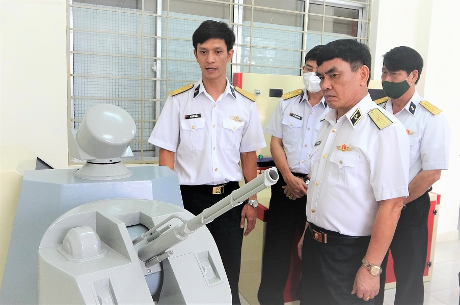 Chuẩn Đô đốc Phạm Khắc Lượng kiểm tra thực tế mô hình điều khiển hệ thống pháo tàu