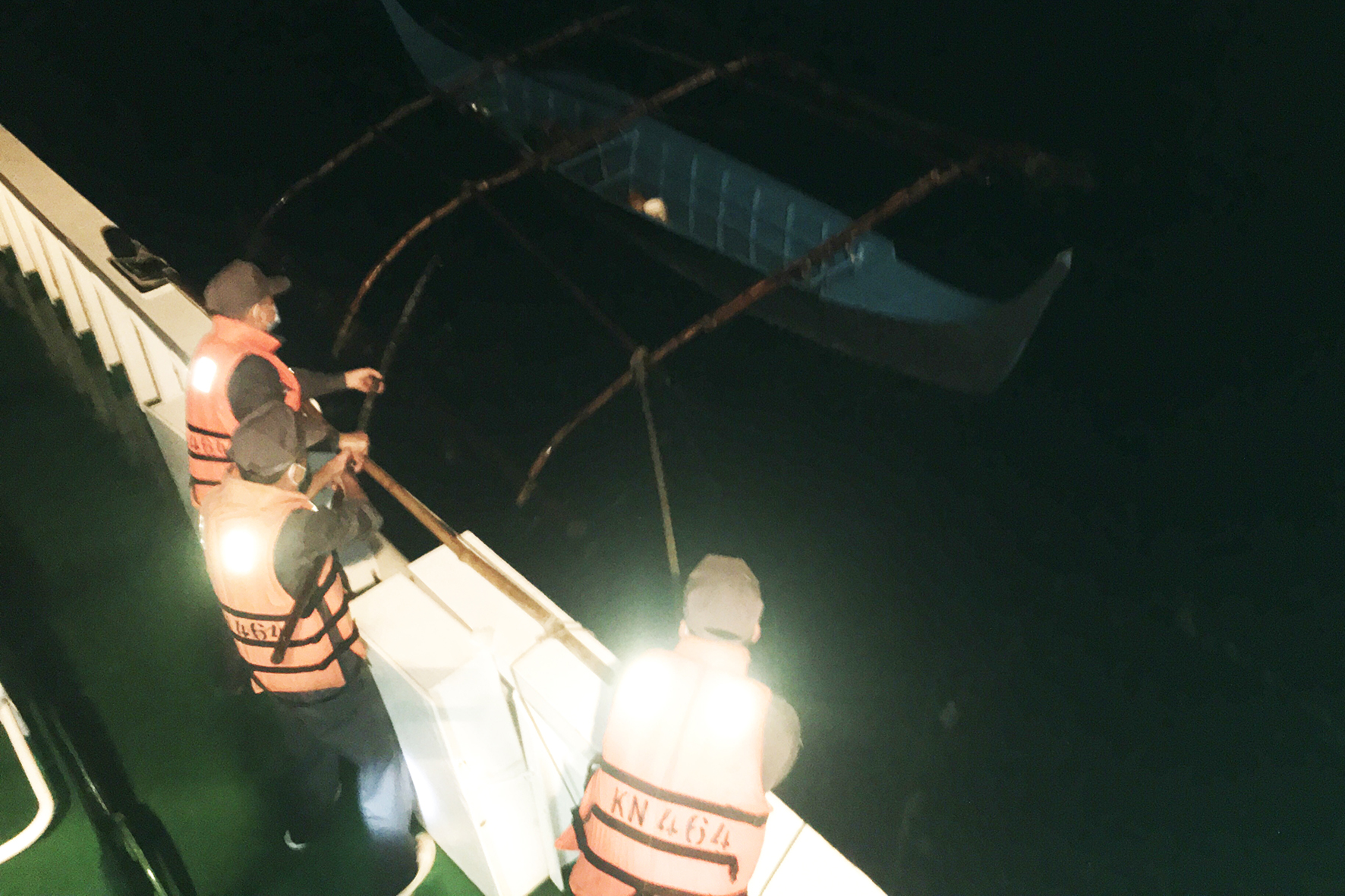 Sau đó một người trên xuồng đã tự nhảy xuống biển bơi vào bờ kè đảo, được cán bộ, chiến sĩ đảo Song Tử Tây kịp thời cứu vớt đưa lên đảo. Người còn lại trên xuồng trôi dạt về hướng Tây Nam, được Tàu KN 464 thuộc Chi đội Kiểm ngư số 4 (đang làm nhiệm vụ trong khu vực) tổ chức tìm kiếm cứu nạn. Đến 19 giờ 40 phút cùng ngày, Tàu KN 464 đã tiếp cận xuồng câu và đưa ngư dân bị nạn lên tàu.