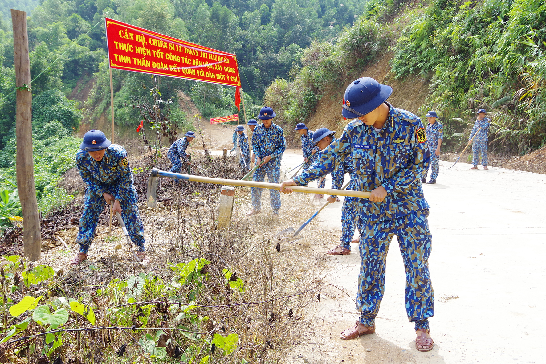 Cán bộ, chiến sĩ Lữ đoàn 101 dọn vệ sinh, phát quang đường giao thông tại xã Sơn Hiệp, huyện Khánh Sơn, tỉnh Khánh Hòa