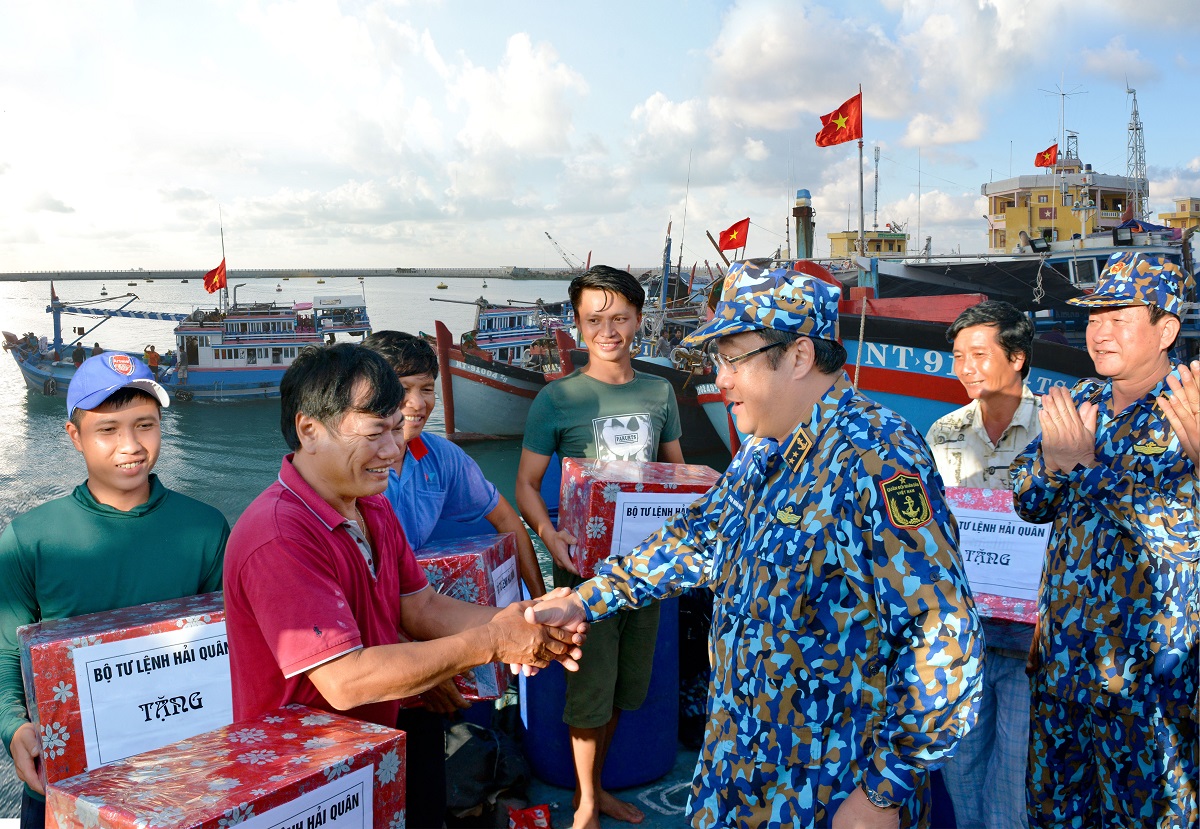 Phó Đô đốc Phạm Hoài Nam, Uỷ viên Trung ương Đảng,Tư lệnh Hải quân thăm, tặng quà ngư dân tại Âu tàu đảo Đá Tây (tháng 4-2019)