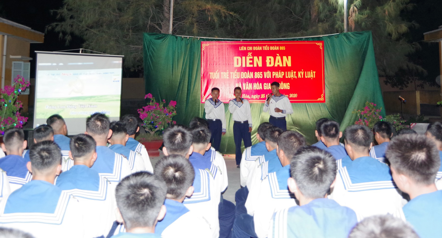 Tối 25-6, tại TP. Cam Ranh, tỉnh Khánh Hòa, Liên Chi đoàn Tiểu đoàn 865, Đoàn cơ sở Lữ đoàn 101, Vùng 4 Hải quân tổ chức diễn đàn thanh niên với chủ đề “Tuổi trẻ Tiểu đoàn 865 với pháp luật, kỷ luật và văn hóa giao thông”.