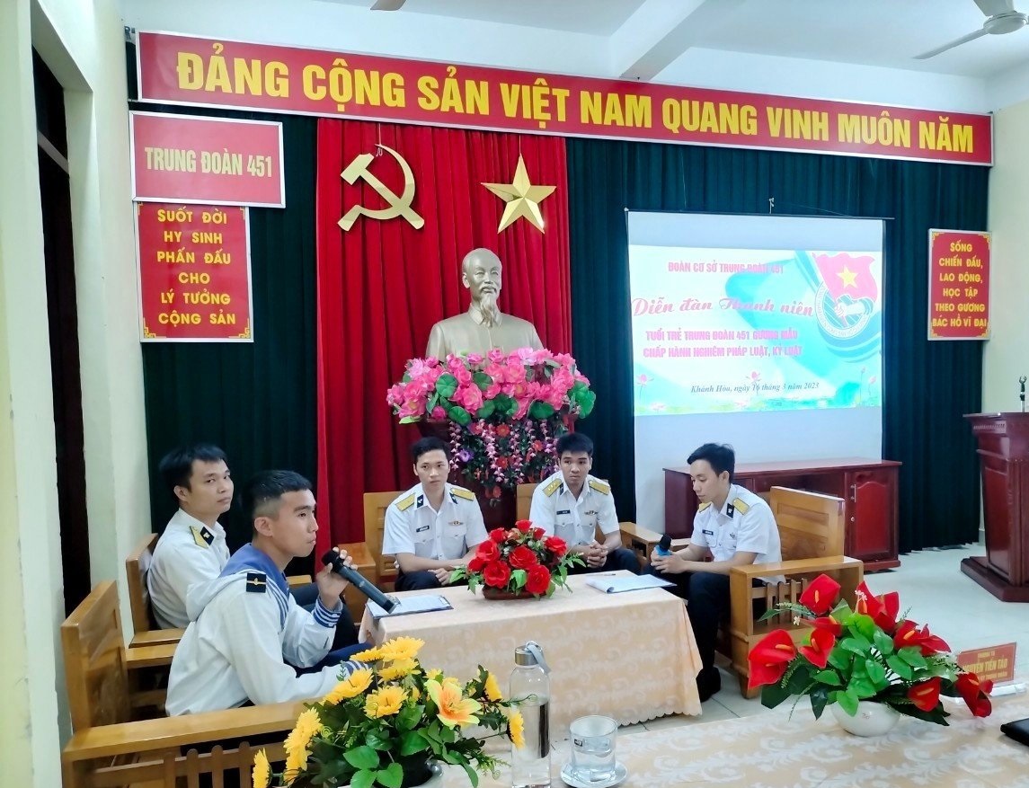 Tối 16/3, tại TP. Cam Ranh, tỉnh Khánh Hòa, Đoàn cơ sở Trung đoàn 451, Vùng 4 Hải quân tổ chức diễn đàn thanh niên với chủ để “Tuổi trẻ Trung đoàn 451 gương mẫu chấp hành nghiêm pháp luật, kỷ luật”.