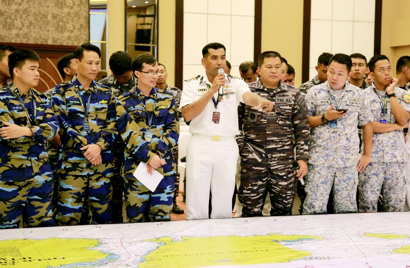 Các sĩ quan Hải quân Indonesia lần lượt lên thuyết trình từng mảng hoạt động trong quá trình diễn tập thực binh trên biển bằng mô phỏng từ khi tàu bắt đầu nhổ neo tham gia diễn tập, chụp ảnh đội hình trên cao đến các tàu vận động vào vị trí tập kết; mô phỏng từng khoa mục diễn tập theo thời gian.