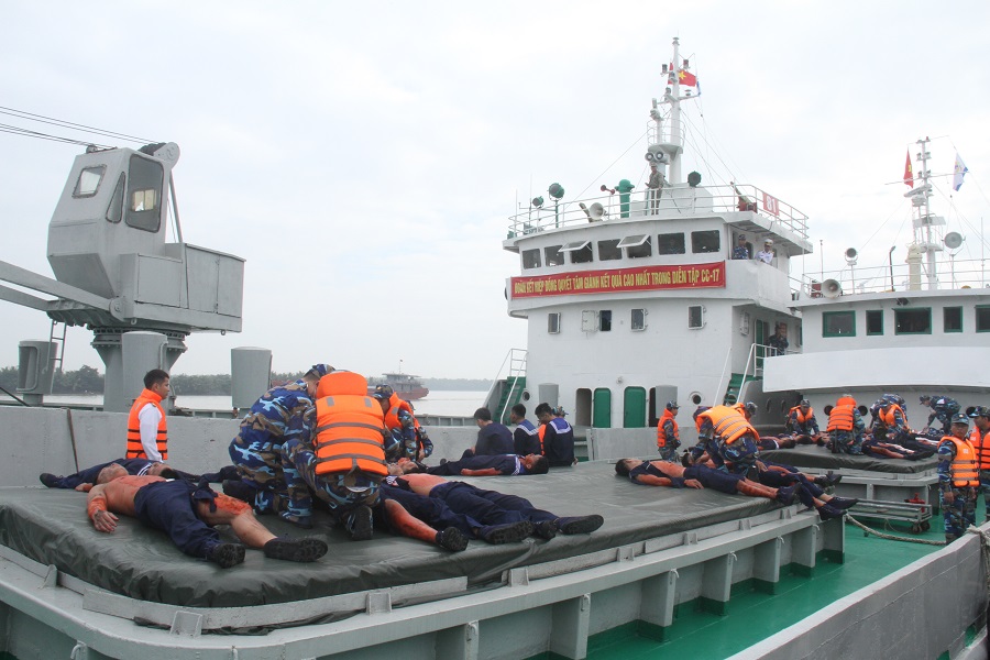 Tình huống trong diễn tập: Khi nhận được tin báo cháy và mệnh lệnh khẩn của cấp trên, các lực lượng ứng cứu đã đến khu vực cháy, triển khai các biện pháp chữa cháy. Lực lượng cứu hộ tiếp cận và cấp cứu ban đầu tại chỗ cho các thương binh. Lực lượng y tế bố trí khu vực sơ cứu trên boong tàu, bảo đảm chức năng sống, hồi sinh tim phổi, khai thông đường thở; tiếp tục phát hiện và sơ cứu chấn thương kết hợp với cố định xương gãy, sai khớp, băng nẹp cầm máu... hỗ trợ tâm lý và yêu cầu bộ phận hỗ trợ nhanh chóng vận chuyển thương binh vào bờ.