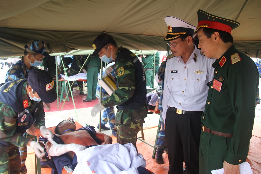 Giai đoạn 2: Diễn tập thực binh gồm 3 nội dung: Tổ chức chữa cháy, cứu vớt, cấp cứu thương binh tại tàu; tổ chức tiếp nhận, phân loại, cứu chữa bước đầu và vận chuyển thương binh về tuyến sau; tổ chức phân loại cứu chữa cơ bản cho thương binh, vận chuyển thương binh nặng vượt quá khả năng cứu chữa về tuyến sau.