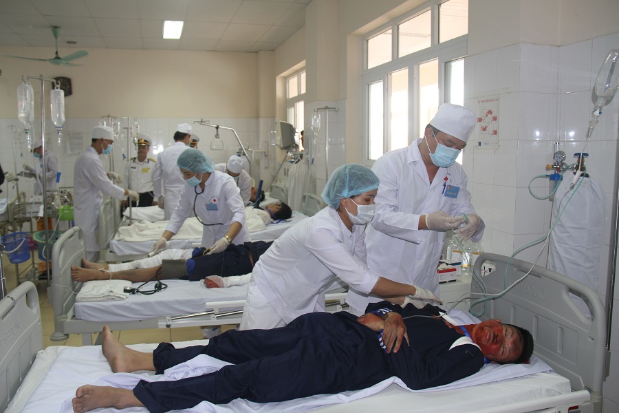 Sau khi toàn bộ thương binh bỏng nặng được chuyển tới Viện Y học Hải quân, tại đây, thương binh tiếp tục được các y, bác sĩ cấp cứu, phân loại bỏng để giữ lại cứu chữa, điều trị và chuyển thương binh nặng lên tuyến trên.