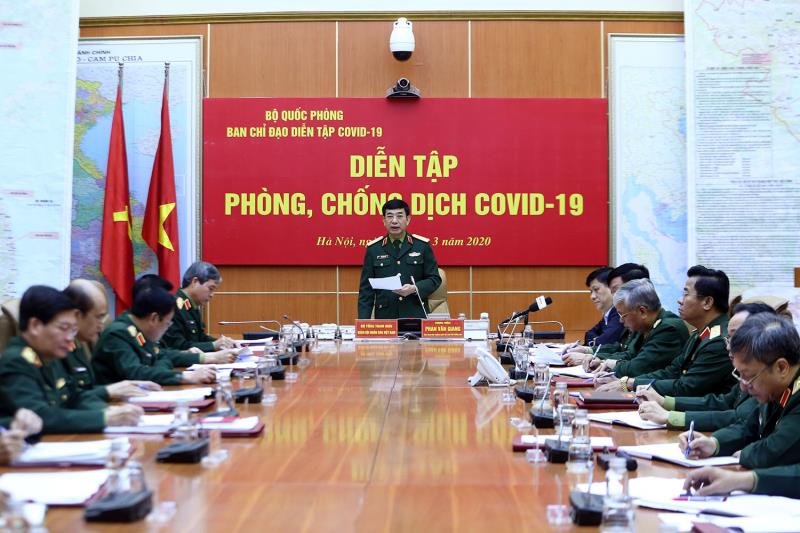 Thượng tướng Phan Văn Giang, Uỷ viên Trung ương Đảng, Ủy viên Thường vụ Quân ủy Trung ương, Tổng Tham mưu trưởng, Thứ trưởng Bộ Quốc phòng, Trưởng ban chỉ đạo phòng, chống dịch Covid-19 Bộ Quốc phòng chủ trì diễn tập.