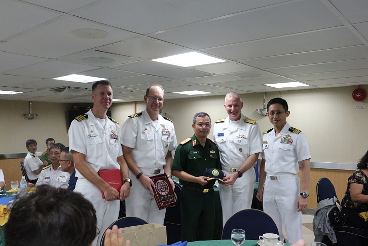 Thiếu tướng Vũ Quốc Bình, Cục trưởng Cục Quân y, Tổng cục Hậu cần trao quà lưu niệm cho chỉ huy Tàu Mercy và Tàu Shikita
