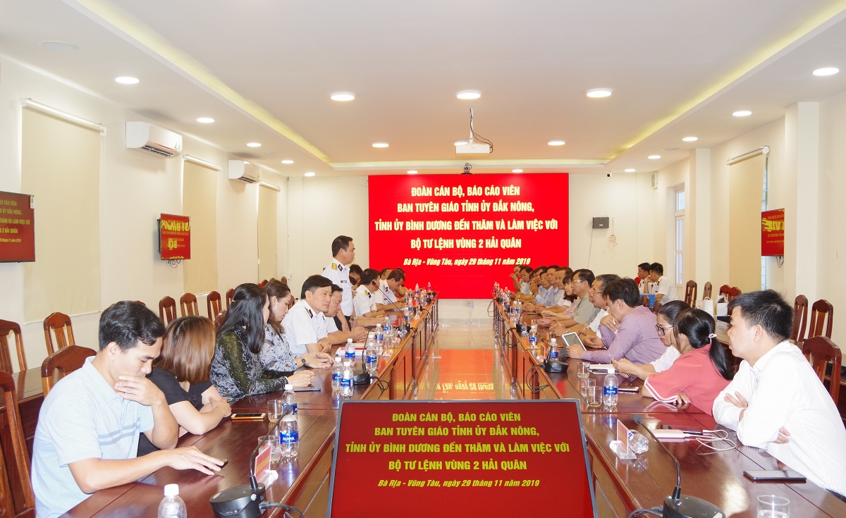 Ngày 29-11, tại Căn cứ quân sự Long Sơn (TP. Vũng Tàu) đoàn cán bộ, báo cáo viên Ban Tuyên giáo Tỉnh ủy Đắk Nông, Tỉnh ủy Bình Dương đã đến thăm và làm việc tại Vùng 2 Hải quân. Đại tá Nguyễn Quốc Văn, Phó Chính ủy Vùng chủ trì tiếp đoàn.