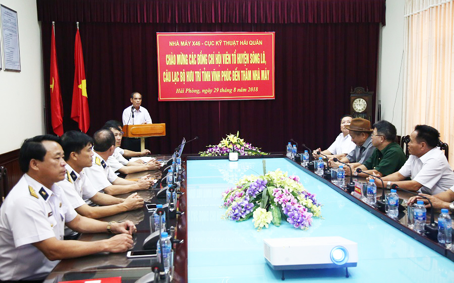 Ngày 29-8, đoàn Cựu chiến binh Hải quân tổ Sông Lô, tỉnh Vĩnh Phúc đến thăm Nhà máy X46, Cục Kỹ thuật Hải quân. Đảng ủy, Ban Giám đốc Nhà máy X46 đã thân mật tiếp đoàn.