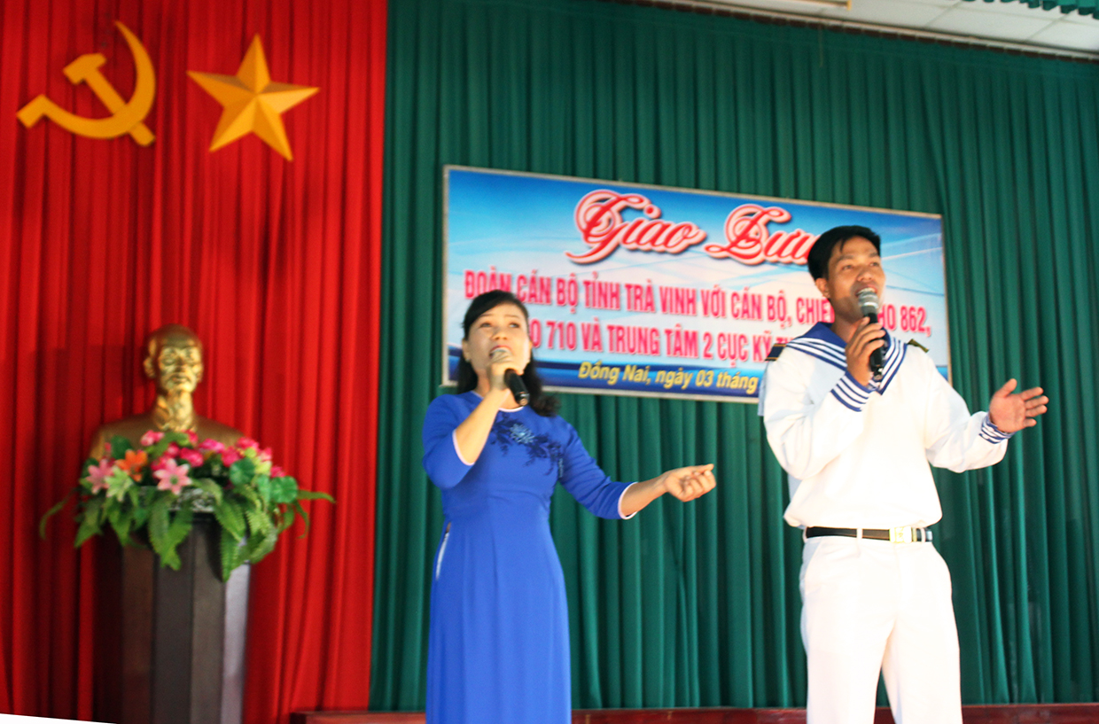 Đoàn công tác đã tham quan nơi ăn ở, sinh hoạt của các đơn vị và ân cần động viên cán bộ, chiến sĩ. Tại Kho 862 đã diễn ra buổi giao lưu văn nghệ với các tiết mục ca múa nhạc ca ngợi Đảng, Bác Hồ, hình ảnh “Bộ đội Cụ Hồ - Người chiến sỹ Hải quân” và biển đảo quê hương do cán bộ, chiến sĩ các đơn vị và các thành viên đoàn công tác tỉnh Trà Vinh cùng biểu diễn.