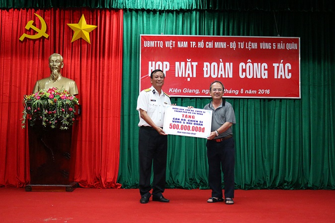 Nhân dịp này, Đoàn đã tặng đơn vị nhiều phần quà ý nghĩa với tổng trị giá gần 3 tỷ đồng. Theo chương trình của chuyến công tác, Đoàn đại biểu UBMTTQ TP. Hồ Chí Minh sẽ cùng đoàn cán bộ của Vùng 5 Hải quân đi thăm, động viên cán bộ, chiến sĩ của đơn vị đóng quân trên các điểm đảo thuộc Vùng.