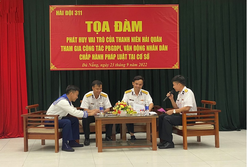 Tối 23/9, tại TP. Đà Nẵng, Liên Chi đoàn Hải đội 311, thuộc Đoàn cơ sở Lữ đoàn 161, Vùng 3 Hải quân tổ chức tọa đàm thanh niên với chủ đề: “Phát huy vai trò của thanh niên Hải quân tham gia công tác phổ biến giáo dục pháp luật, vận động nhân dân chấp hành pháp luật tại cơ sở”.
