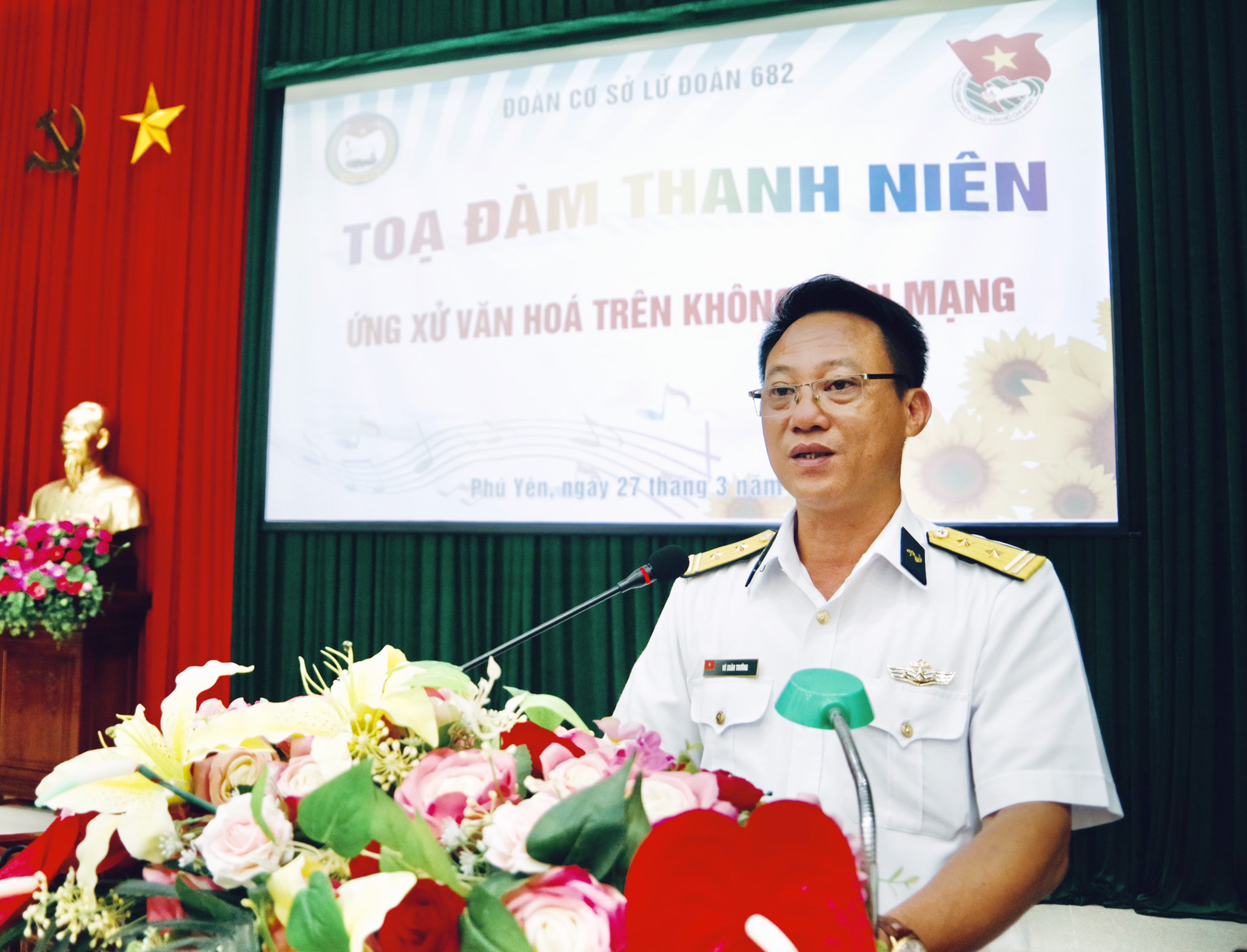Tối 27/3, tại TP. Tuy Hòa, tỉnh Phú Yên, Đoàn cơ sở Lữ đoàn 682, Vùng 4 Hải quân tổ chức tọa đàm thanh niên với chủ đề “Ứng xử văn hóa trên không gian mạng”. Thượng tá Trần Quang Trung, Chính ủy Lữ đoàn dự và chỉ đạo.