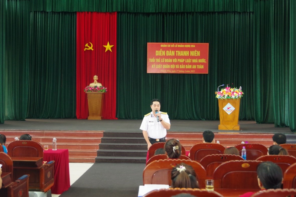 Ngày 27/4, tại TP.Cam Ranh, tỉnh Khánh Hòa, Đoàn cơ sở Lữ đoàn Không quân Hải quân 954 tổ chức diễn đàn thanh niên với chủ đề “Tuổi trẻ Lữ đoàn với pháp luật Nhà nước, kỷ luật Quân đội và bảo đảm an toàn”. Dự và chỉ đạo diễn đàn có Trung tá Hoàng Văn Thuyên, Bí thư Đảng uỷ, Chính ủy Lữ đoàn.