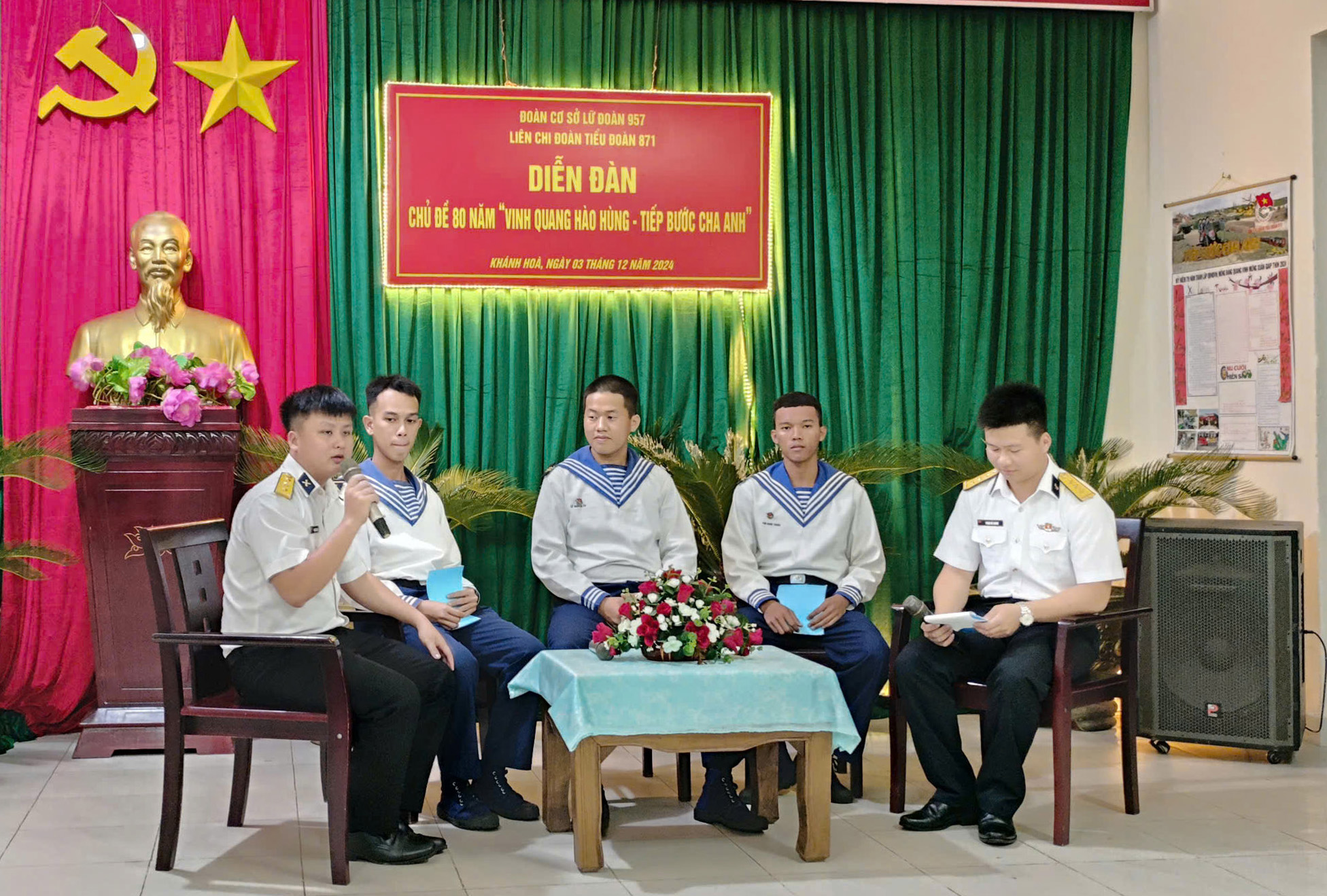 Tối 3/12, tại TP. Cam Ranh, tỉnh Khánh Hoà, Liên chi đoàn Tiểu đoàn 871 thuộc Đoàn cơ sở Lữ đoàn 957, Vùng 4 Hải quân tổ chức diễn đàn với chủ đề “80 năm Vinh quang hào hùng – Tiếp bước cha anh”.