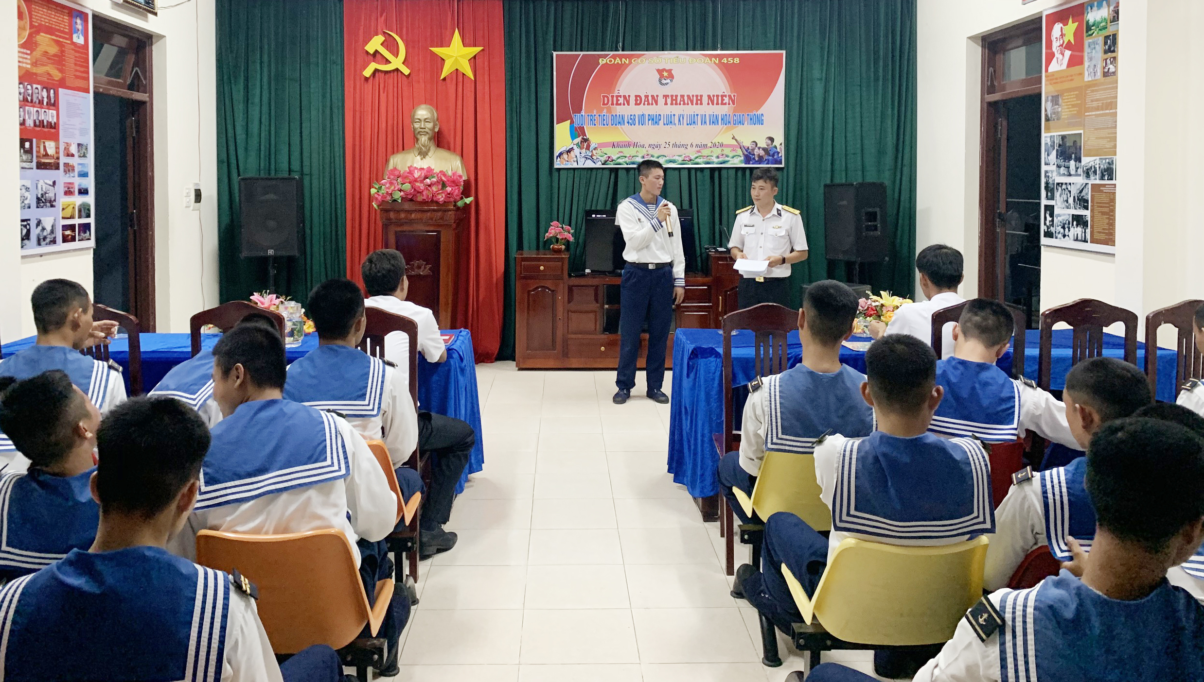 Tối 25-6, tại Khánh Hòa, Đoàn cơ sở Tiểu đoàn 458, Vùng 4 Hải quân tổ chức diễn đàn thanh niên với chủ đề “Tuổi trẻ Tiểu đoàn 458 với pháp luật, kỷ luật và văn hóa giao thông”. Tham gia diễn đàn có gần 100 cán bộ, đoàn viên thanh niên đơn vị.