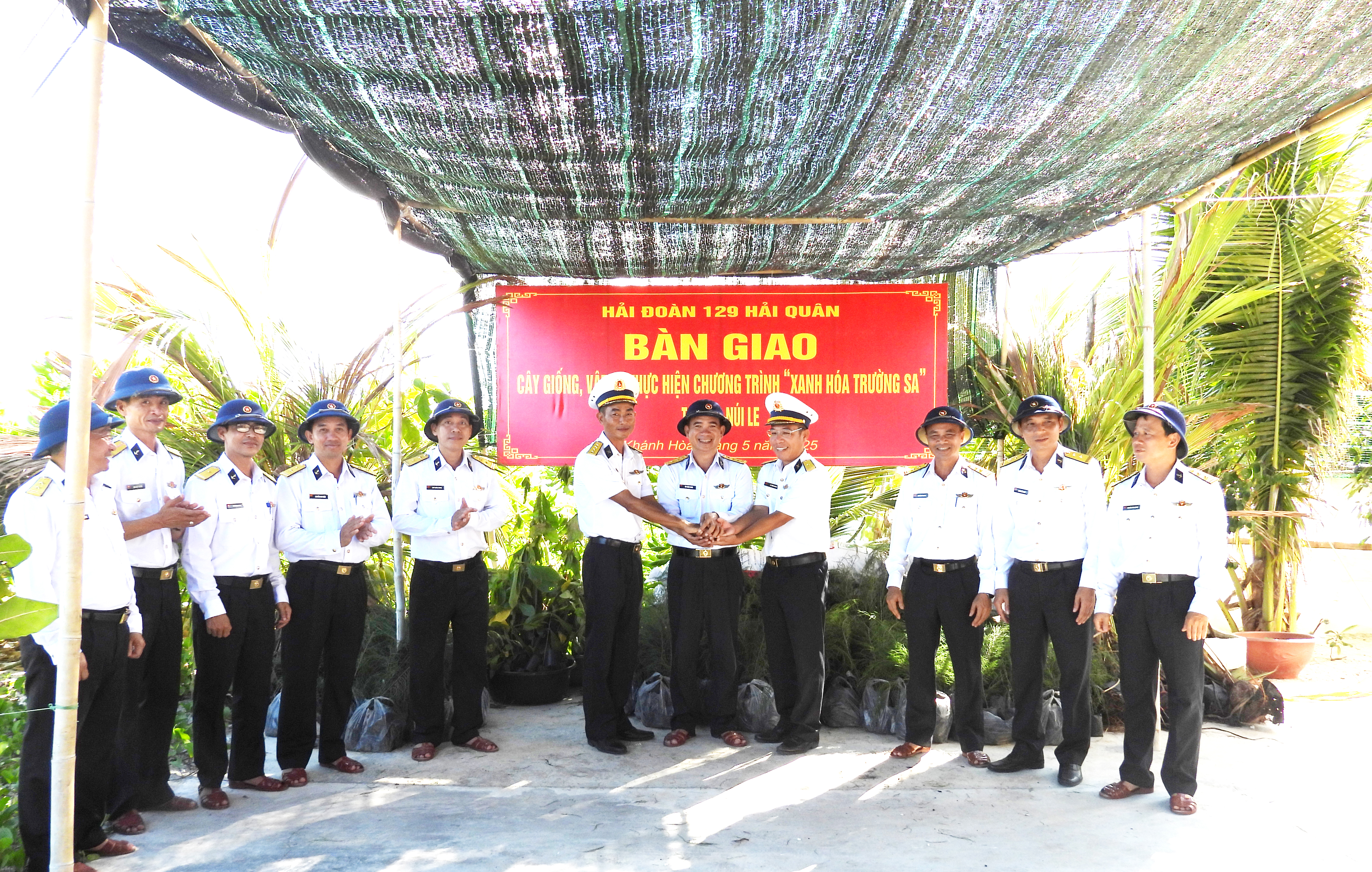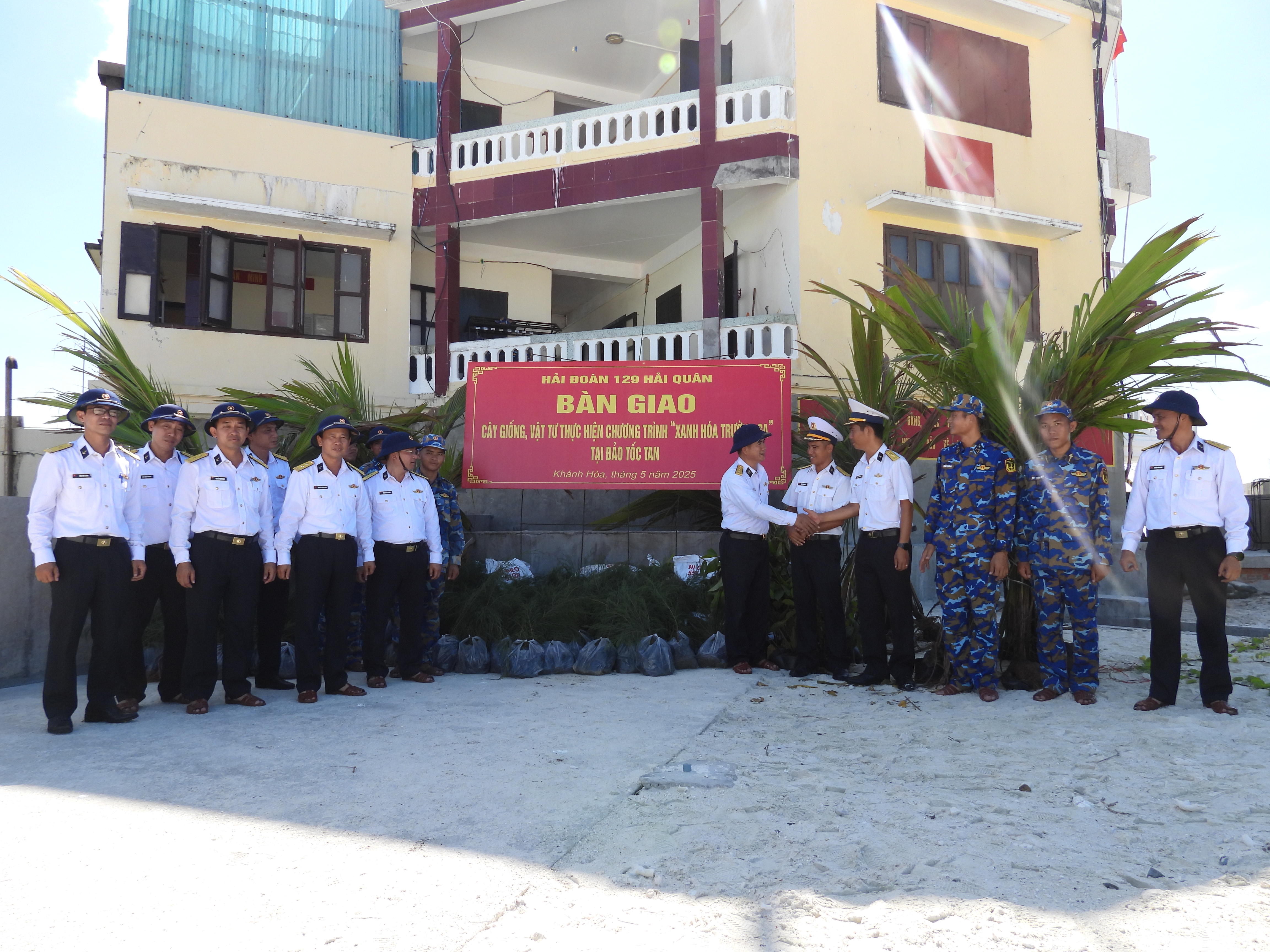 Cũng trong dịp này, thực hiện chương trình “Xanh hóa Trường Sa”, đoàn công tác của Hải đoàn 129 đã bàn giao 2.340 cây giống các loại và vật tư trồng cây tại đảo Tốc Tan và đảo Núi Le. Qua đó, góp phần cải tạo môi trường sống, xây dựng Trường Sa xanh – sạch – đẹp, gần gũi hơn với đất liền.