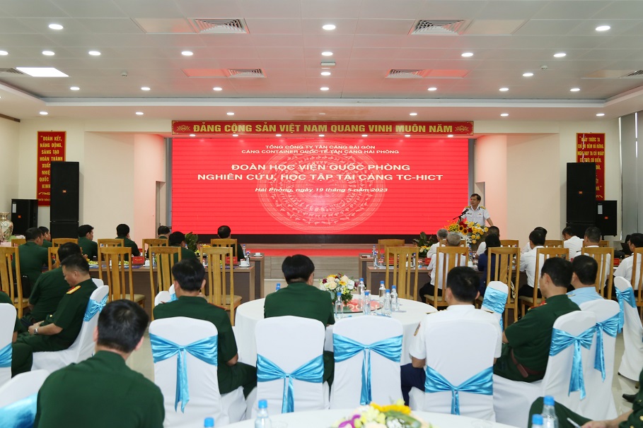Sáng 19/5, tại TP. Hải Phòng, đoàn công tác của Học viện Quốc phòng do Thiếu tướng, PGS, TS. Nguyễn Văn Đông, Cục trưởng Cục Huấn luyện - Đào tạo, Học viện Quốc phòng làm trưởng đoàn đến tham quan, nghiên cứu thực tế tại Cảng container quốc tế Tân cảng Hải Phòng (TC-HICT) thuộc Tổng công ty Tân cảng Sài Gòn.