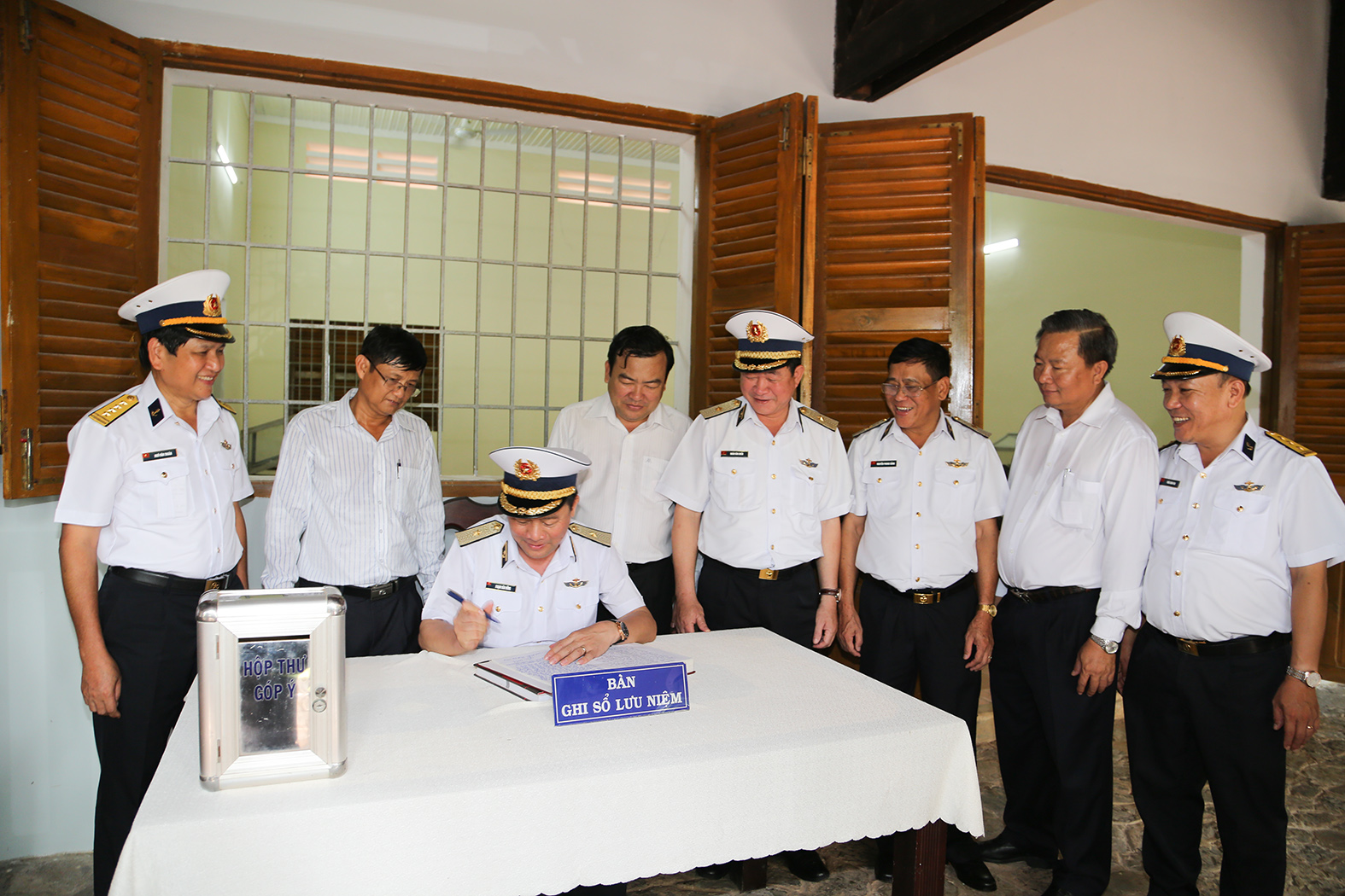 Chuẩn Đô đốc Phạm Văn Vững ghi sổ lưu niệm tại Khu di tích lịch sử Căn cứ TWCMN