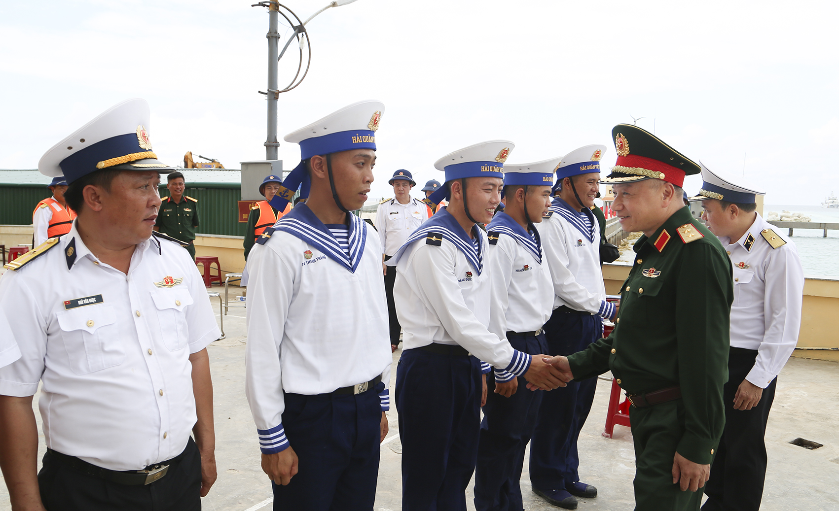 Cán bộ, chiến sĩ đảo Đá Lớn B đón Trung tướng Lê Quang Minh và đoàn công tác
