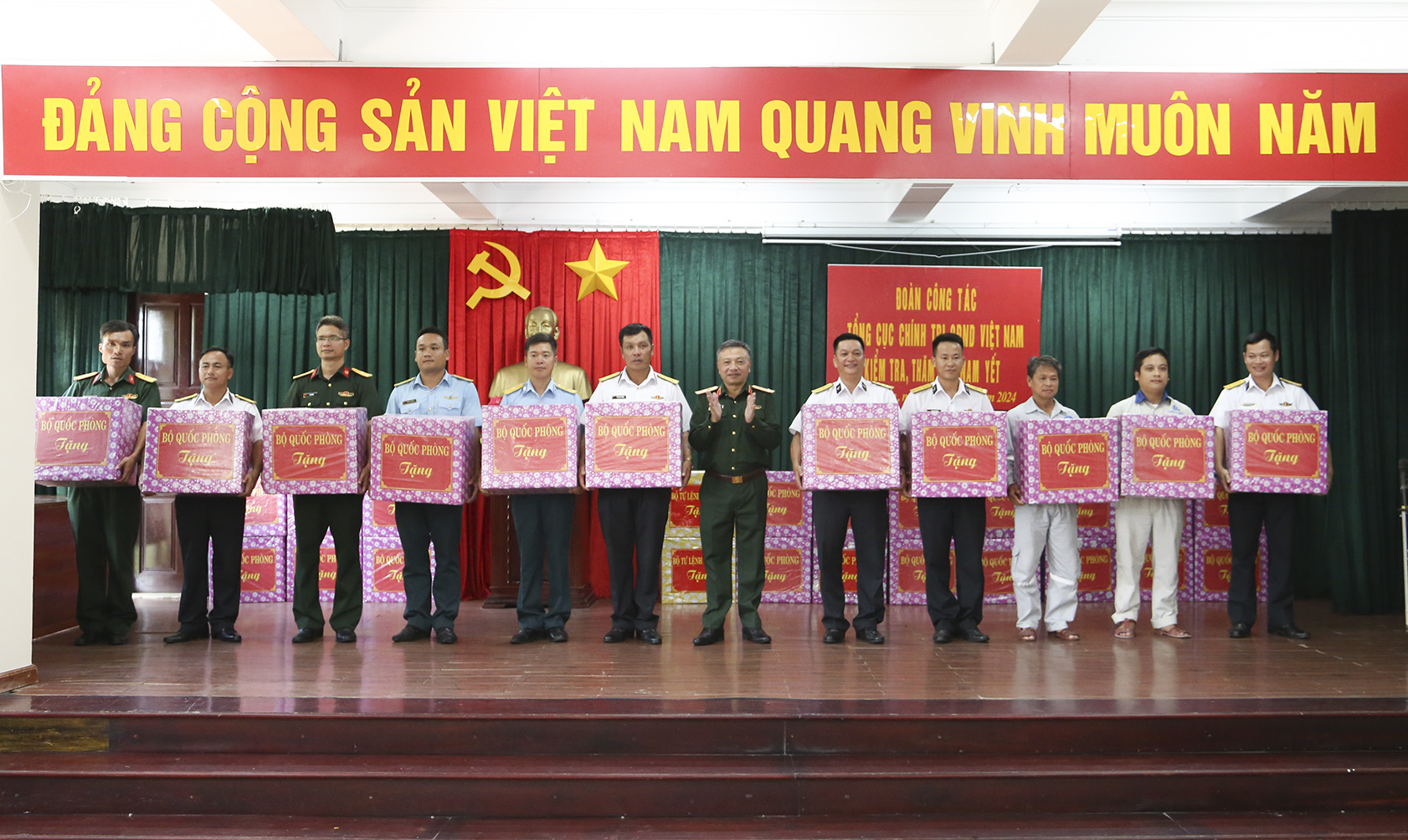Đoàn công tác cũng đã trao tặng hàng trăm phần quà của Bộ Quốc phòng, Tổng cục Chính trị; quà của các cơ quan, đơn vị đến quân, dân các đảo thuộc huyện đảo Trường Sa, Nhà giàn DK1.