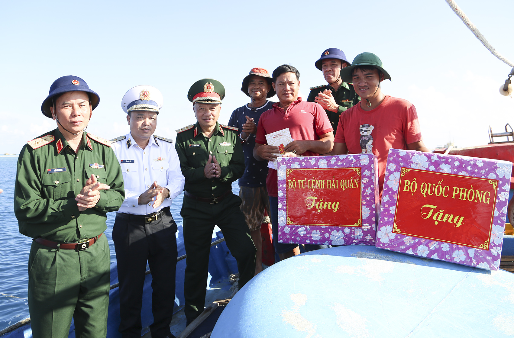 Trung tướng Lê Quang Minh và Chuẩn Đô đốc Đỗ Văn Yên tặng quà các tàu cá đang khai thác hải sản ở khu vực biển Trường Sa