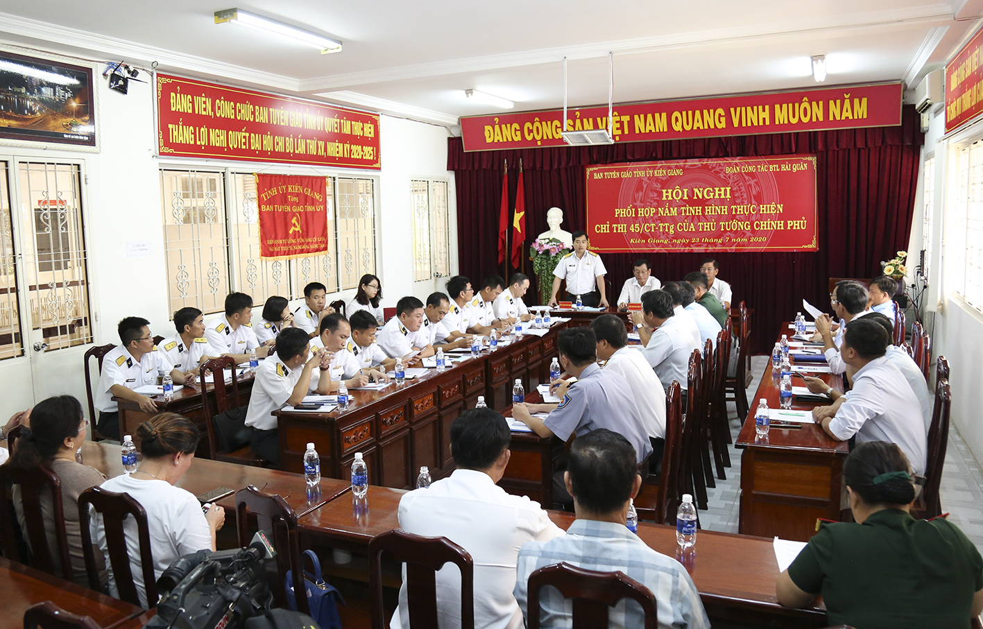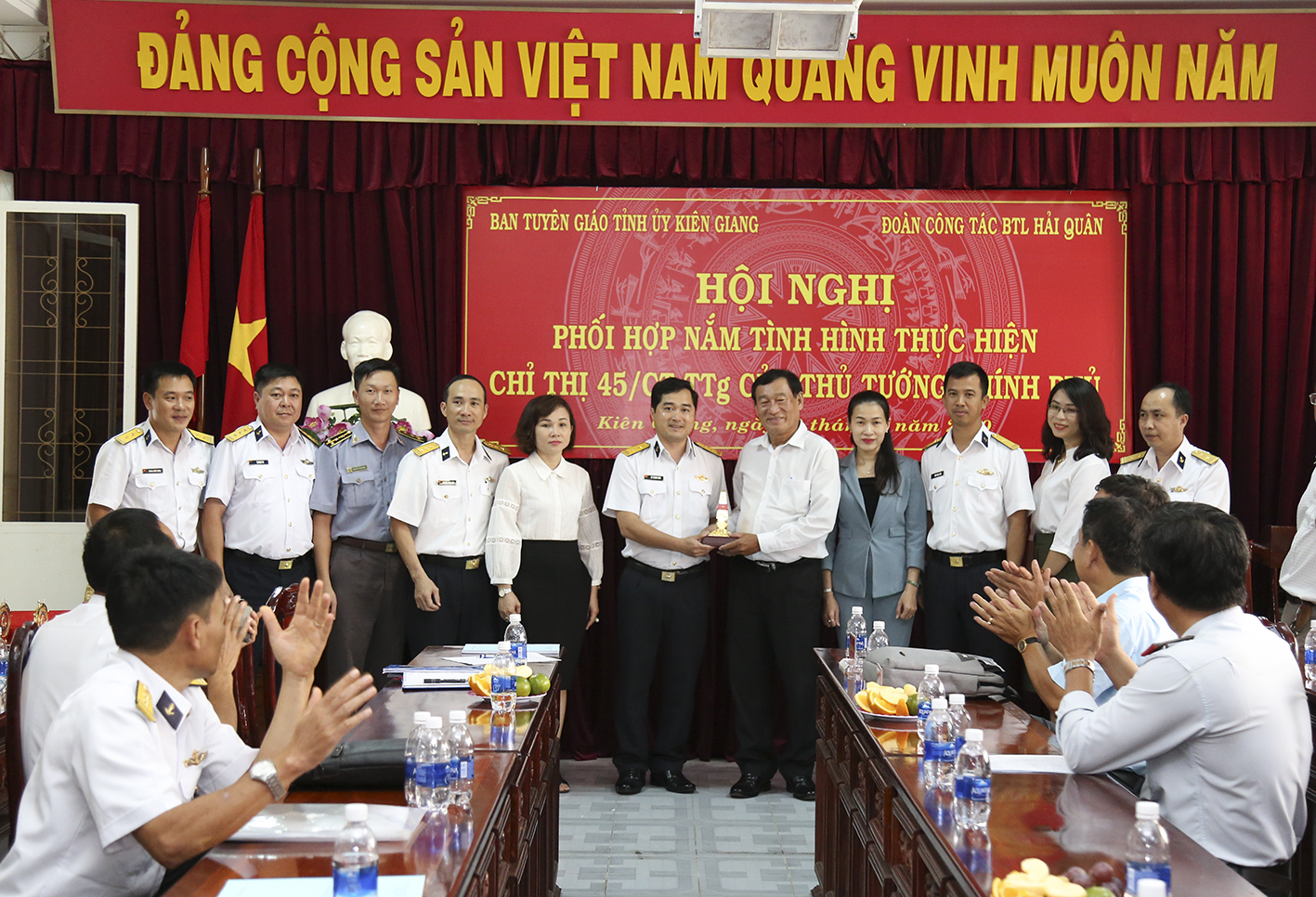 Đoàn công tác Quân chủng Hải quân chia sẻ với những khó khăn mà tỉnh Kiên Giang đang triển khai, thực hiện Chỉ thị 45/CT-TTg đồng thời thông tin về một số hoạt động của Hải quân Việt Nam thời gian qua. Đoàn đề nghị các ngành chức năng của tỉnh tiếp tục phối hợp chặt chẽ với các đơn vị của Quân chủng Hải quân thực hiện tốt mục tiêu của chương trình “Hải quân Việt Nam làm điểm tựa cho ngư dân vươn khơi, bám biển”. Sau buổi làm việc lần này, Quân chủng Hải quân sẽ cấp 10.000 bộ tài liệu tuyên truyền cho ngư dân theo yêu cầu của tỉnh Kiên Giang.
