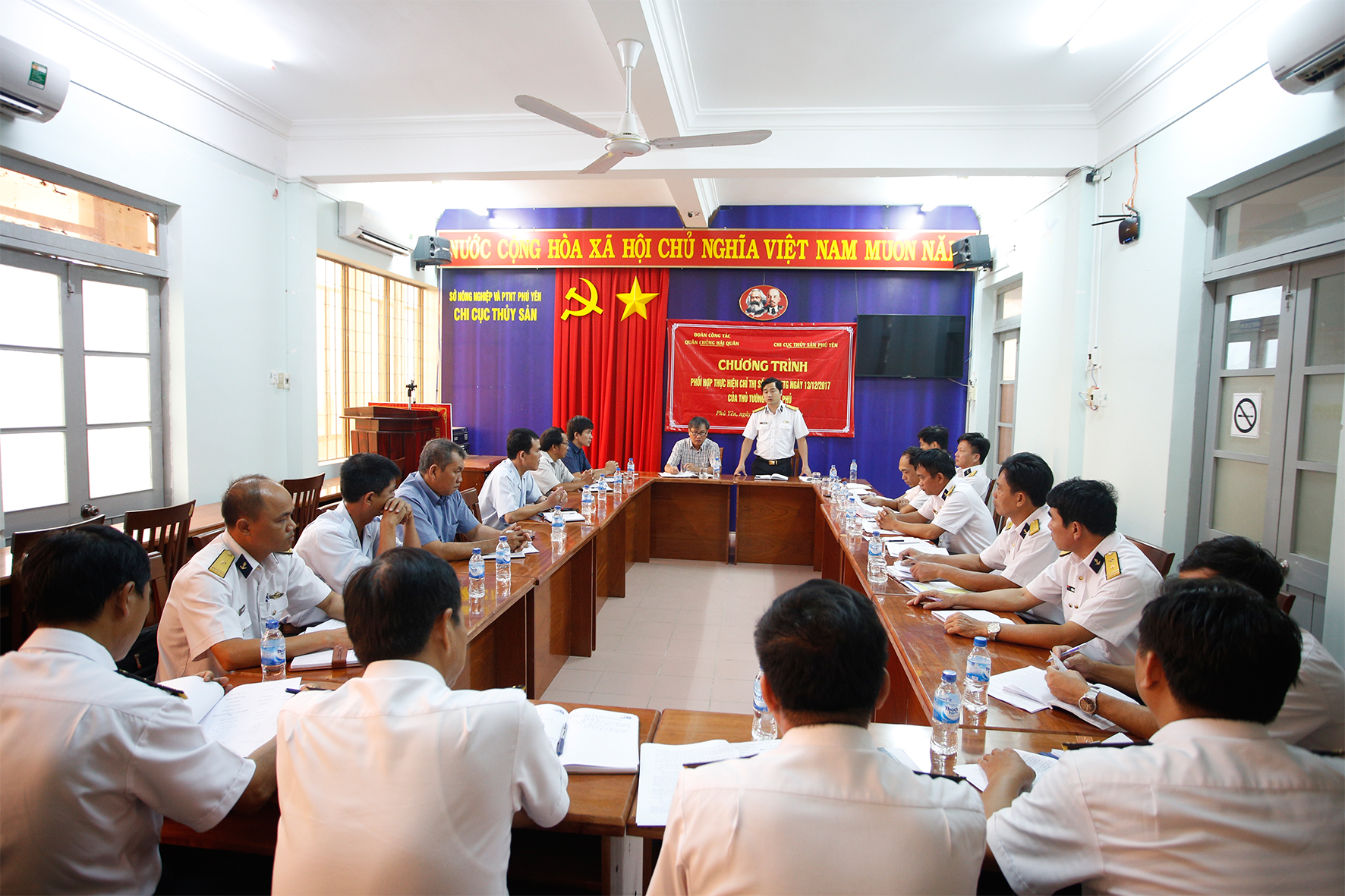 Ngày 30-7, tại tỉnh Phú Yên, đoàn công tác của Quân chủng Hải quân do Trung tá Lê Thanh Sơn, Trưởng phòng Kinh tế Hải quân làm trưởng đoàn đã làm việc với Ban Tuyên giáo Tỉnh ủy, Chi cục Thủy sản tỉnh Phú Yên, nắm tình hình thực hiện Chỉ thị 45/CT-TTg.