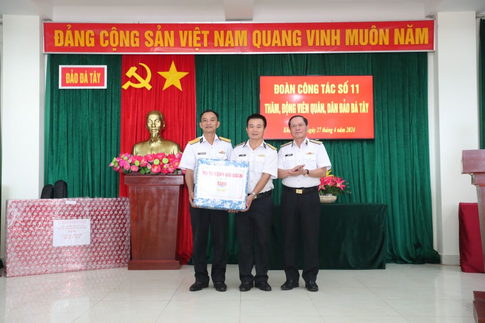 Đồng chí Phó Chủ nhiệm Chính trị Hải quân trao quà của Quân chủng tặng cán bộ, chiến sĩ đảo Đá Tây A