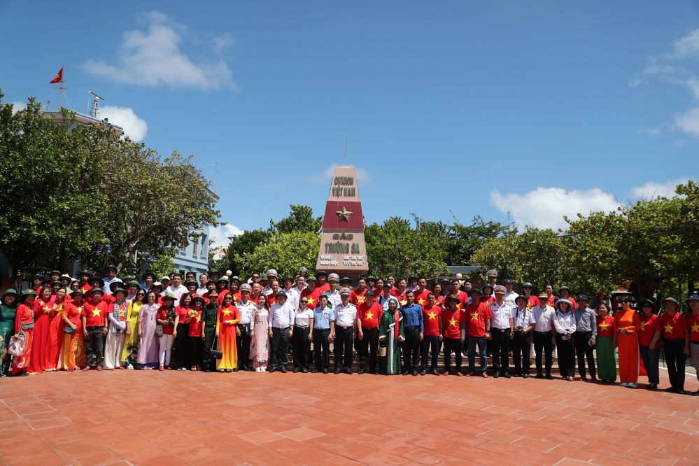 Các đại biểu chụp ảnh lưu niệm bên cột mốc chủ quyền Trường Sa