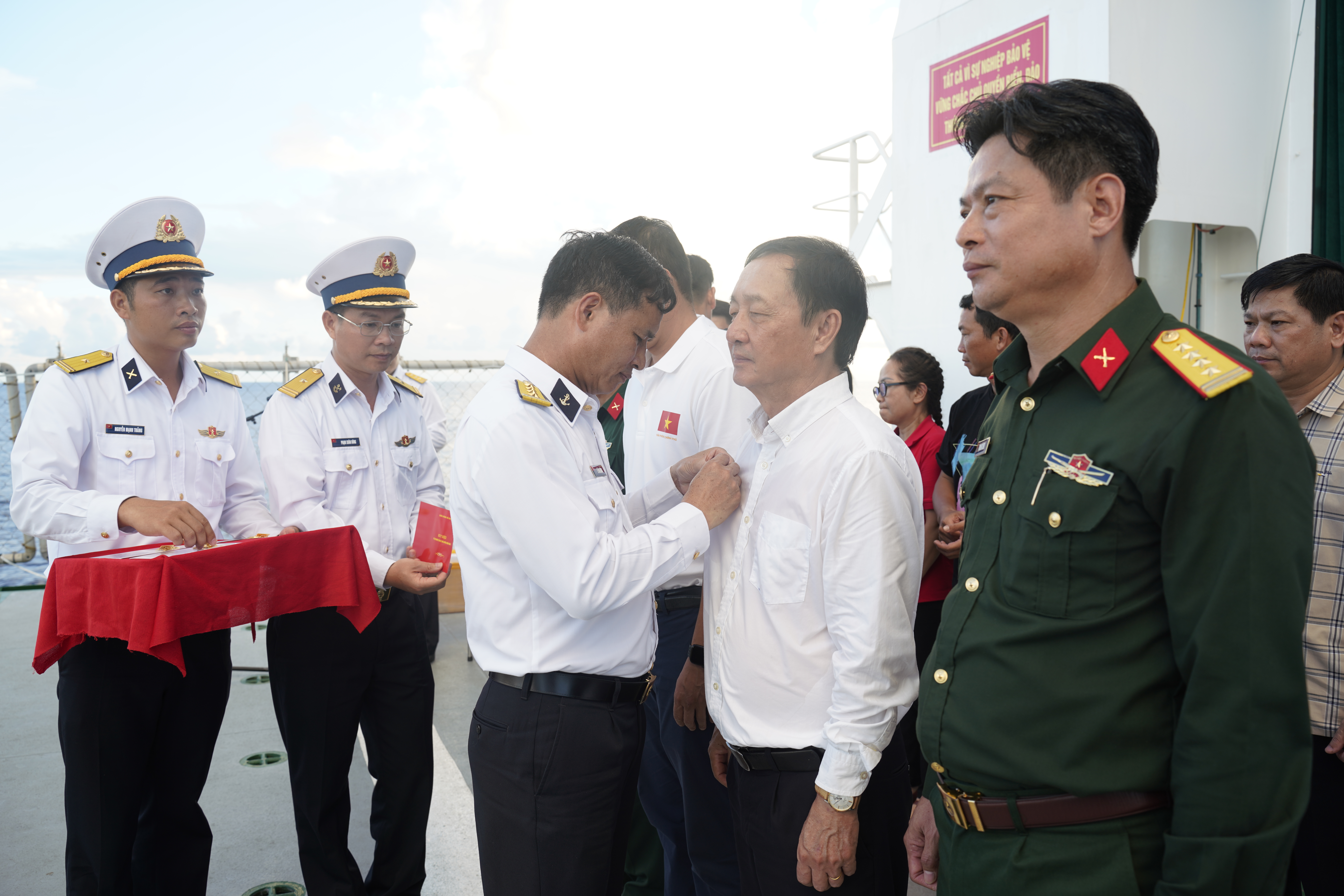 Trưởng đoàn công tác gắn Huy hiệu “Vì sự nghiệp bảo vệ chủ quyền biển đảo” cho lãnh đạo đoàn công tác và các đại biểu có nhiều đóng góp đối với sự nghiệp bảo vệ chủ quyền biển đảo của Tổ quốc