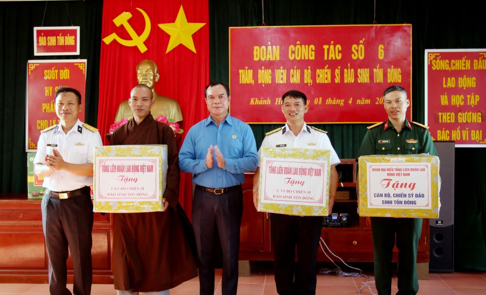 Đồng chí Nguyễn Đình Khang, Ủy viên Trung ương Đảng, Chủ tịch Tổng Liên đoàn Lao động Việt Nam tặng quà nhà chùa và các lực lượng công tác trên đảo Sinh Tồn Đông