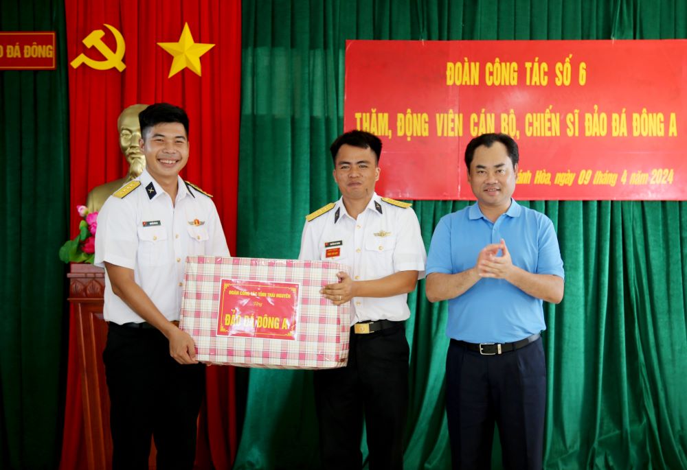 Đồng chí Trịnh Việt Hùng, Ủy viên dự khuyết Ban chấp hành Trung ương Đảng, Phó Bí thư Tỉnh ủy, Chủ tịch UBND tỉnh Thái Nguyên tặng quà cán bộ, chiến sĩ đảo Đá Đông A
