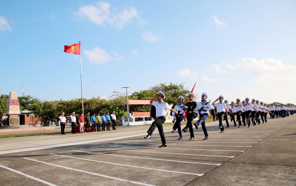 Đoàn công tác dự lễ chào cờ, duyệt đội ngũ của đảo Trường Sa