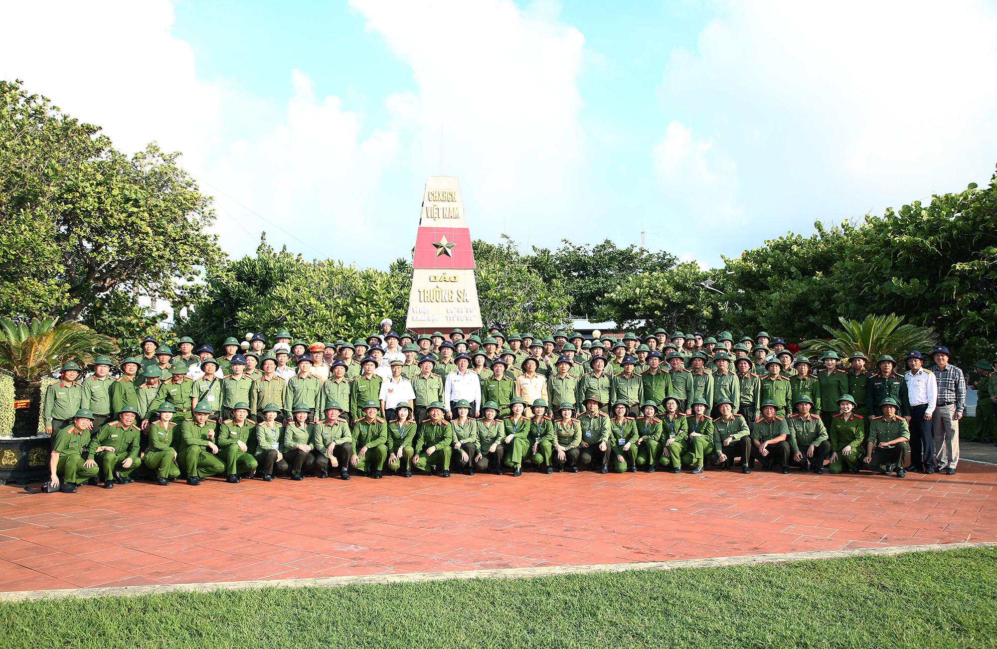 Các đại biểu chụp ảnh lưu niệm tại cột mốc chủ quyền trên đảo Trường Sa