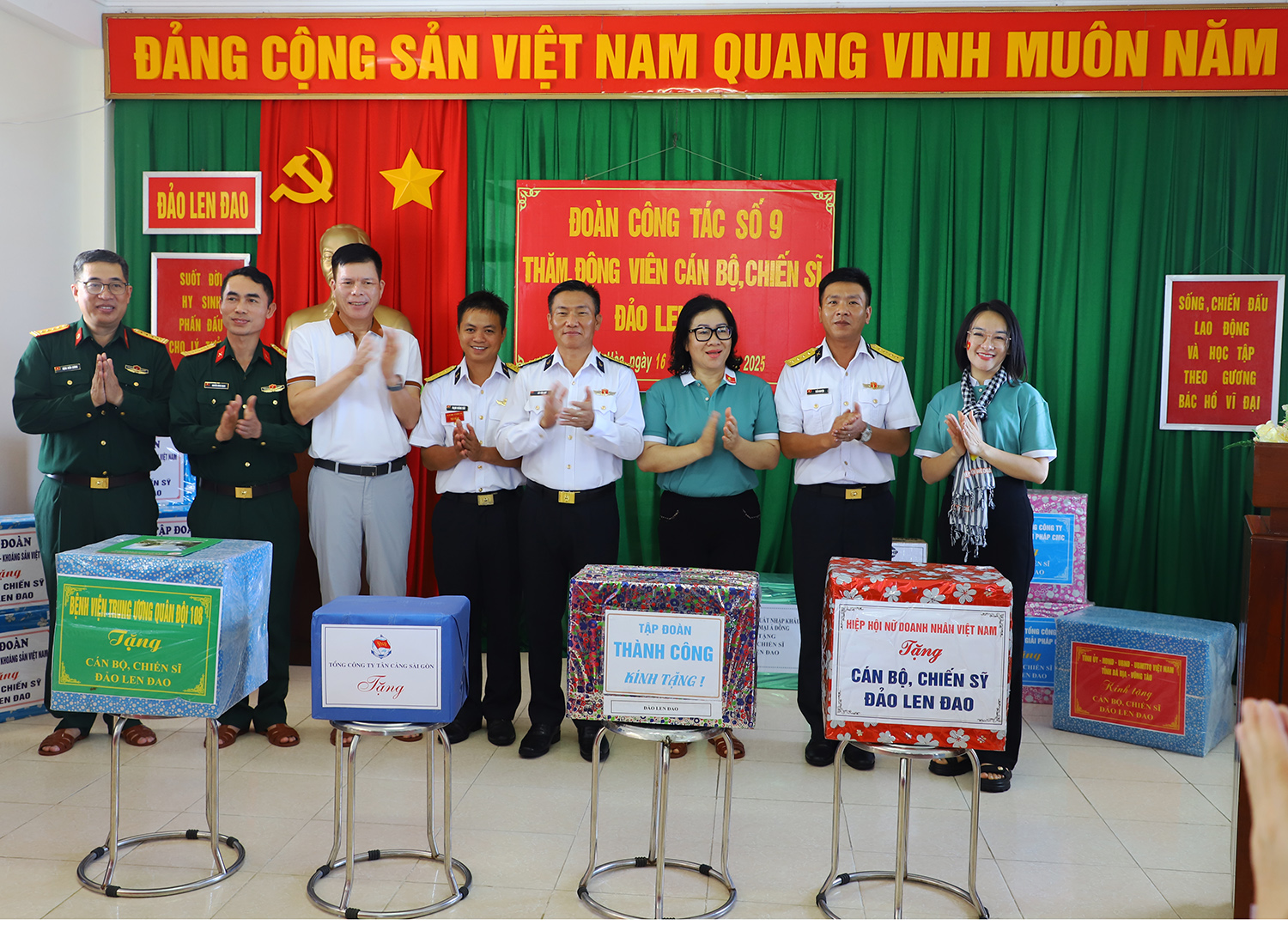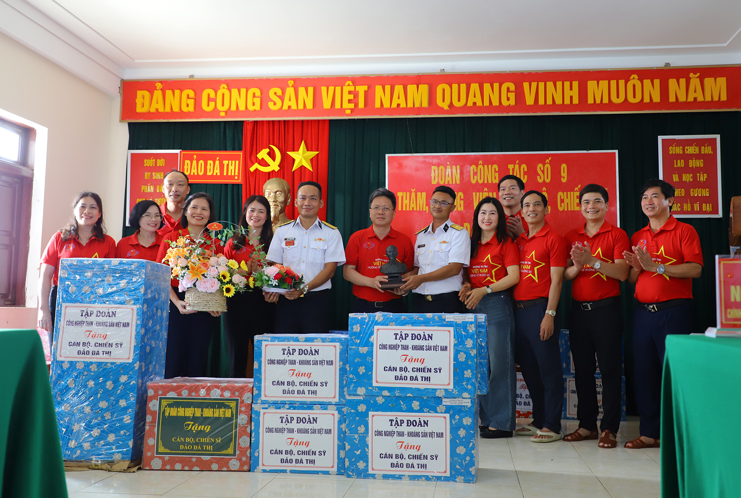 Đoàn công tác số 9 gồm có các đại biểu thuộc các tỉnh Quảng Ninh; Yên Bái; Bà Rịa-Vũng Tàu; Tập đoàn Công nghiệp Than-Khoáng sản Việt Nam; Bệnh viện Trung ương Quân đội 108; Hội nữ Doanh nhân Việt Nam; Tổng công ty Công nghệ và giải pháp CMC; Công ty XNK và TM Á Đông; Công ty Tư vấn thẩm định giá-VCHP; các đồng chí khách mời của Quân chủng Hải quân; các văn nghệ sĩ; phóng viên báo chí.