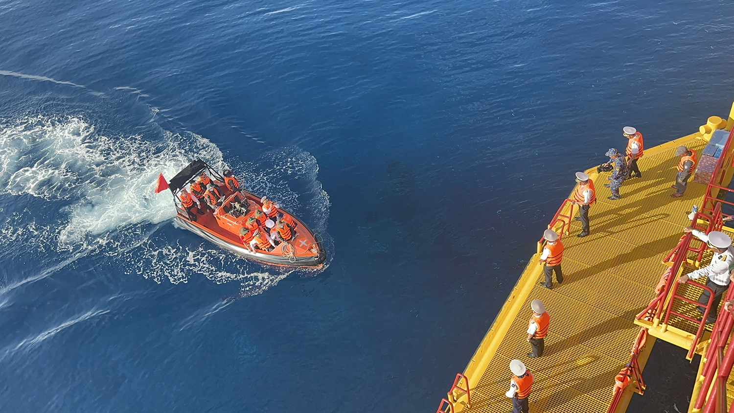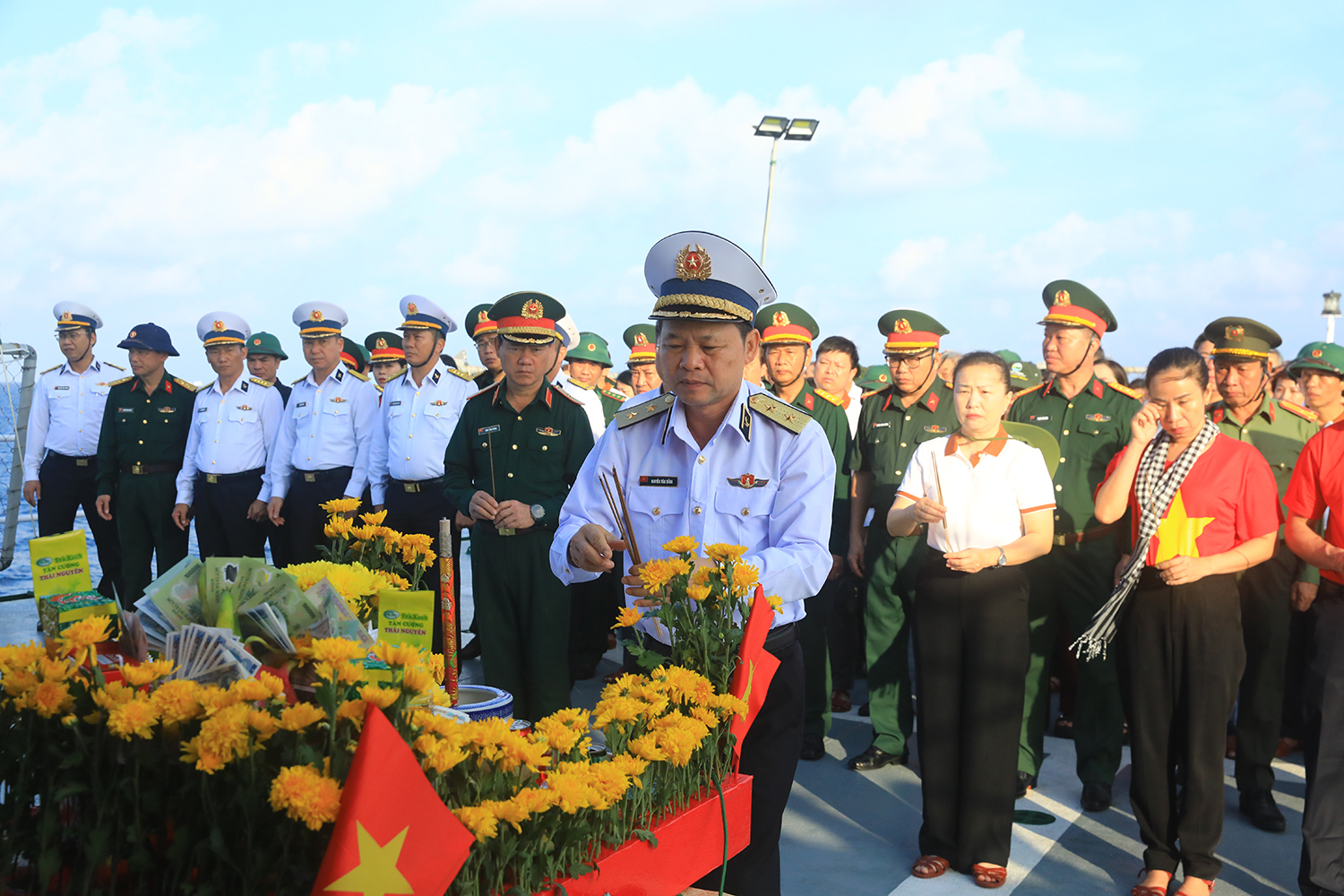 Đoàn công tác tổ chức Lễ tưởng niệm các Anh hùng liệt sĩ hy sinh vì sự nghiệp bảo vệ chủ quyền biển đảo tại quần đảo Trường Sa. Ảnh: Lê Nam