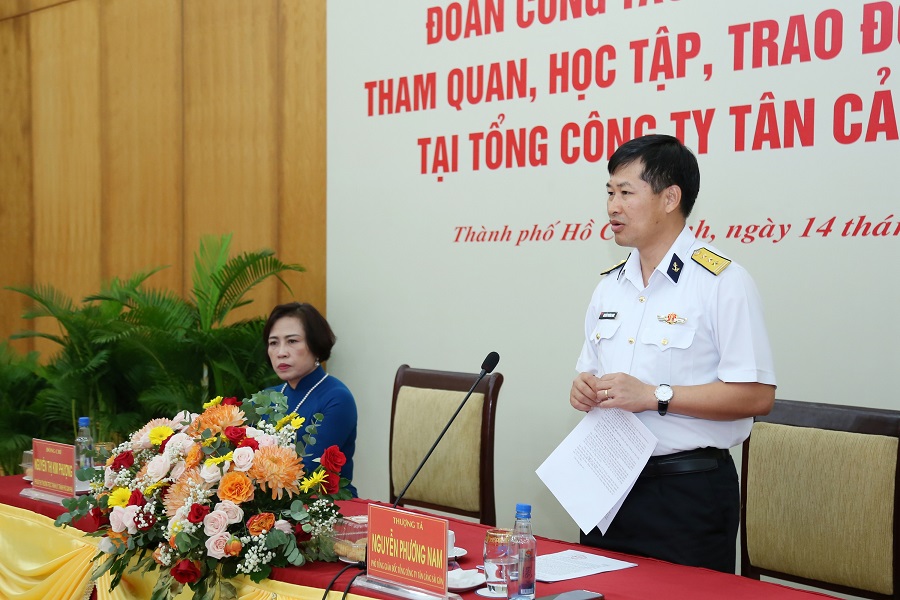 Sau khi tìm hiểu thực tế hoạt động quân sự, quốc phòng và sản xuất kinh doanh tại cảng Tân cảng Cát Lái, đoàn công tác có buổi làm việc với lãnh đạo Tổng công ty Tân cảng Sài Gòn.