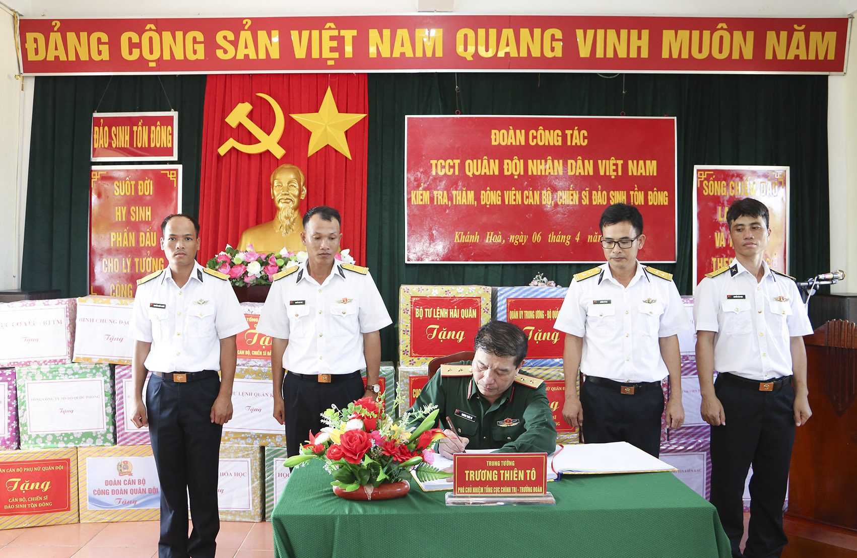 Từ ngày 3 đến 11/4, đoàn công tác Tổng cục Chính trị QĐND Việt Nam do Trung tướng Trương Thiên Tô, Phó chủ nhiệm Tổng cục Chính trị làm trưởng đoàn, đã đi thăm, kiểm tra tại huyện đảo Trường Sa (tỉnh Khánh Hòa) và Nhà giàn DK1 trên thềm lục địa phía Nam của Tổ quốc.
