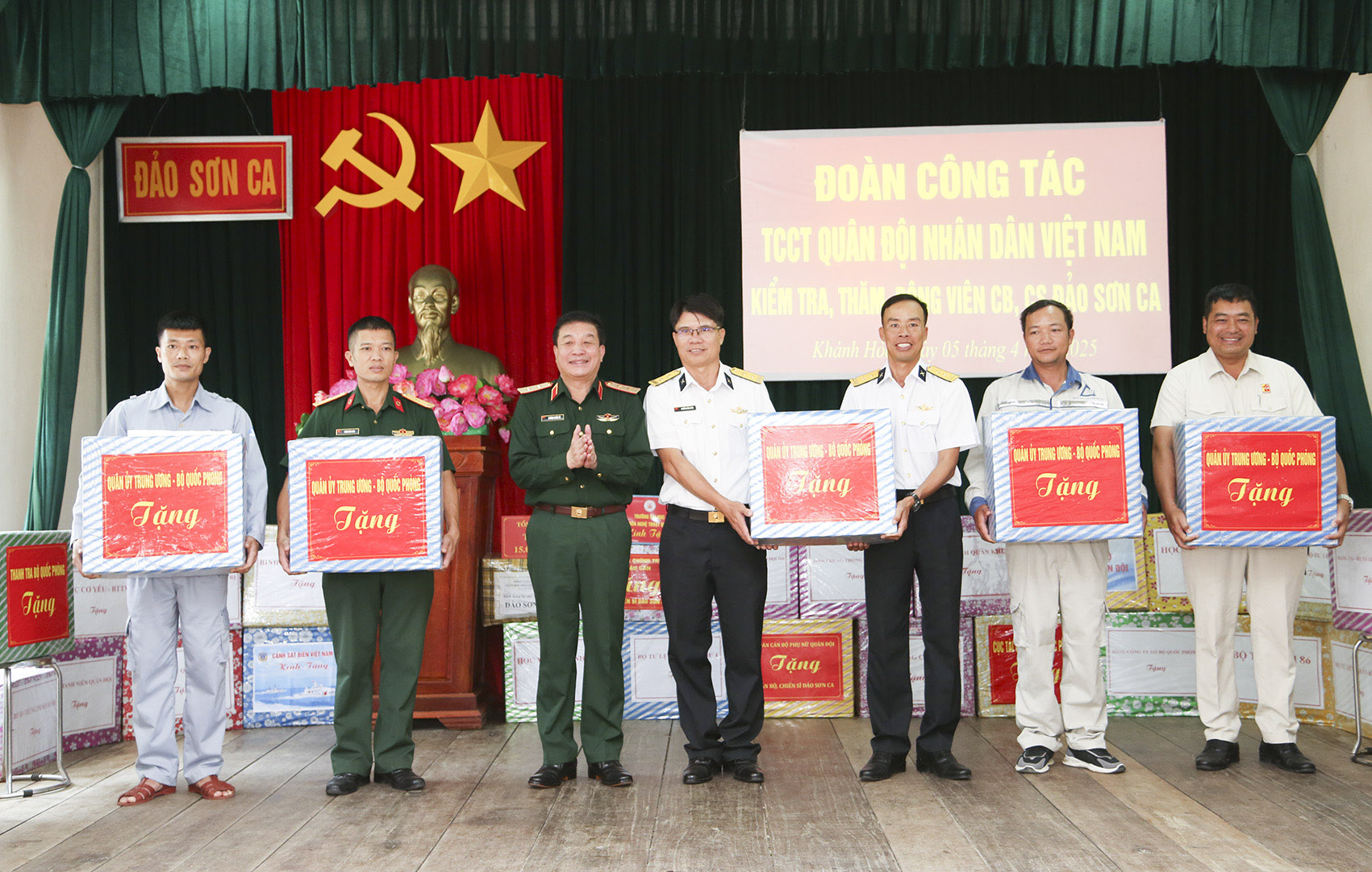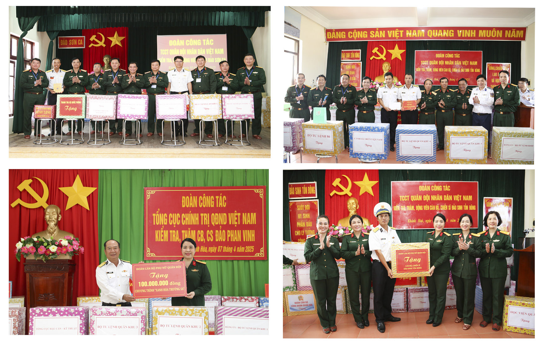 Đoàn công tác cũng đã trao tặng hàng trăm phần quà của Bộ Quốc phòng, Tổng cục Chính trị đến quân dân các đảo thuộc quần đảo Trường Sa, Nhà giàn DK1/12.