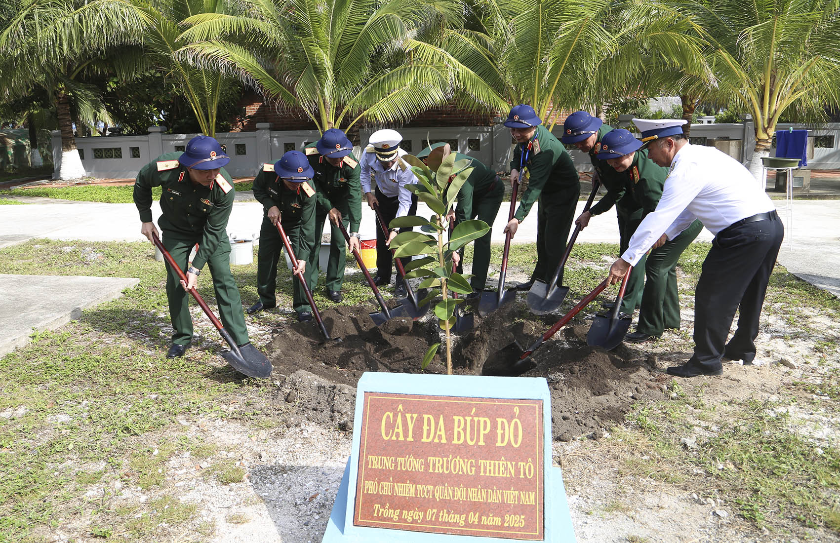 Thủ trưởng đoàn công tác và các đại biểu trồng cây lưu niệm trên đảo Phan Vinh A