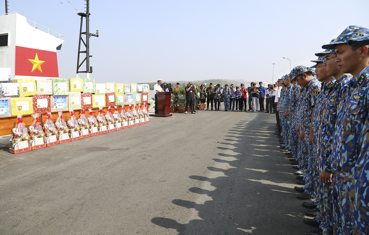 Chiều 29-12, tại Căn cứ Long Sơn, TP. Vũng Tàu, Bộ Tư lệnh Vùng 2 Hải quân tổ chức các chuyến tàu chở đoàn công tác đi thăm, chúc Tết, tặng quà cán bộ, chiến sĩ Nhà giàn DK1, các tàu trực và các cơ quan dân chính đảng, các đơn vị đóng quân trên huyện Côn Đảo, tỉnh Bà Rịa-Vũng Tàu.