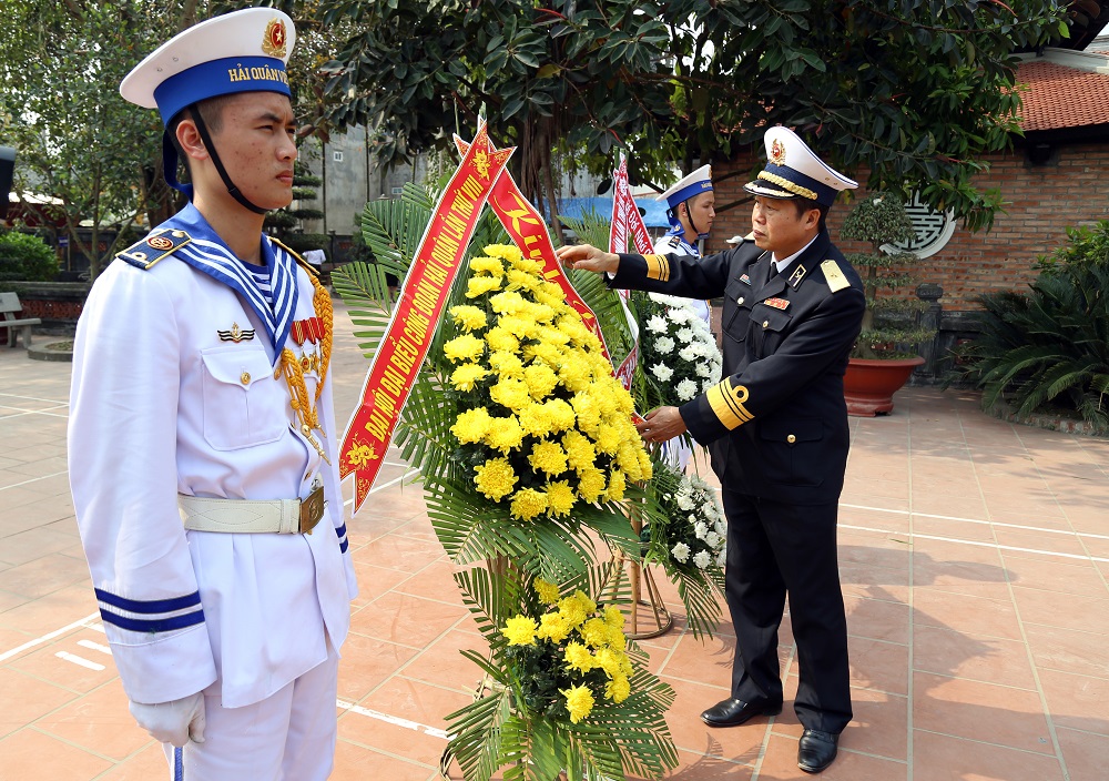 Chuẩn Đô đốc Đặng Minh Hải kiểm tra lẵng hoa trước khu tưởng niệm lãnh tụ Nguyễn Đức Cảnh