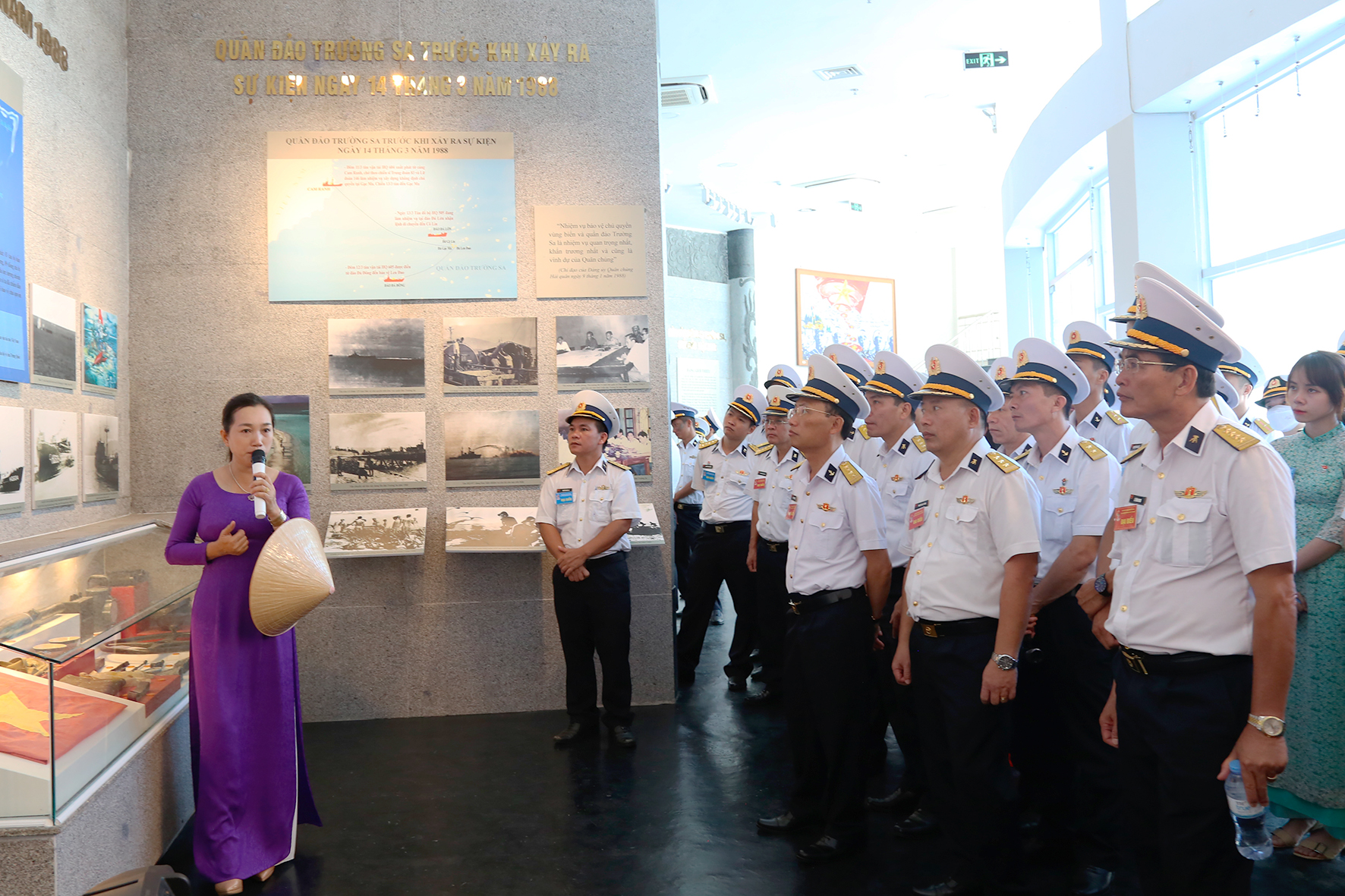 Sau lễ dâng hương, dâng hoa, các đại biểu đã vào tham quan và nghe giới thiệu về các hình ảnh, tư liệu tại Khu tưởng niệm chiến sĩ Gạc Ma.