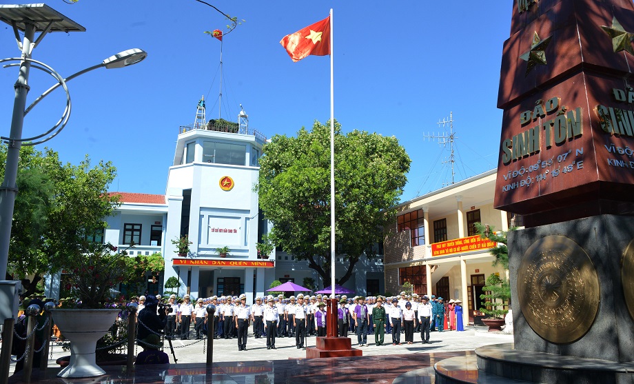 Lãnh đạo đoàn công tác tham gia chào cờ cùng quân dân đảo Sinh Tồn