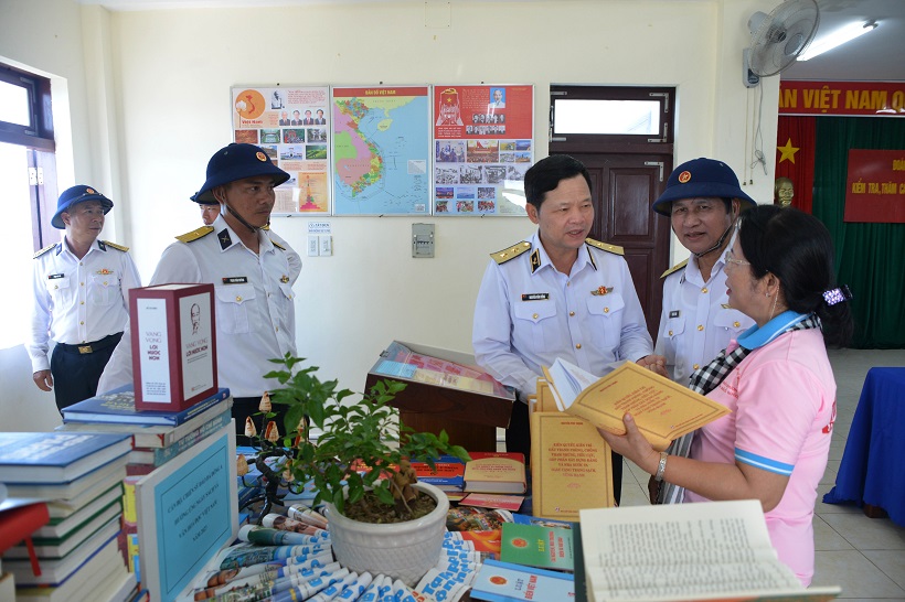Chính ủy Hải quân và lãnh đạo TP. Hồ Chí Minh tham quan các ấn phẩm sách báo trưng bày ở đảo Đá Đông