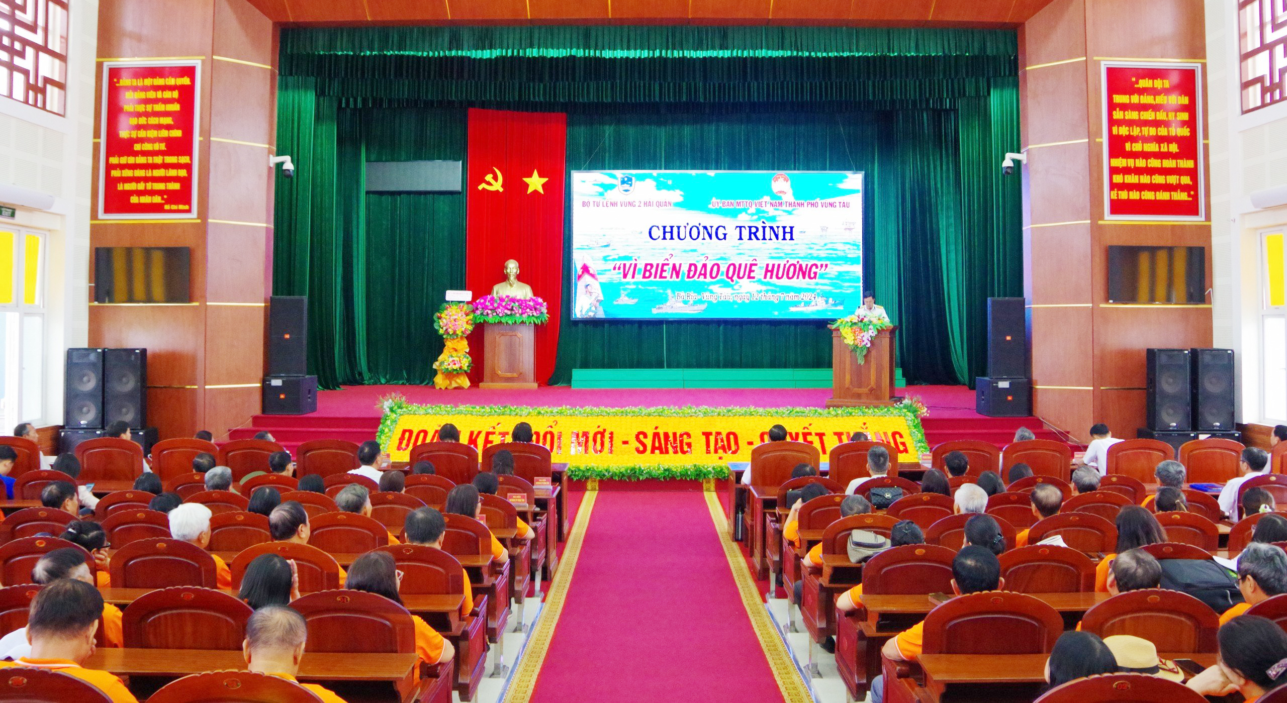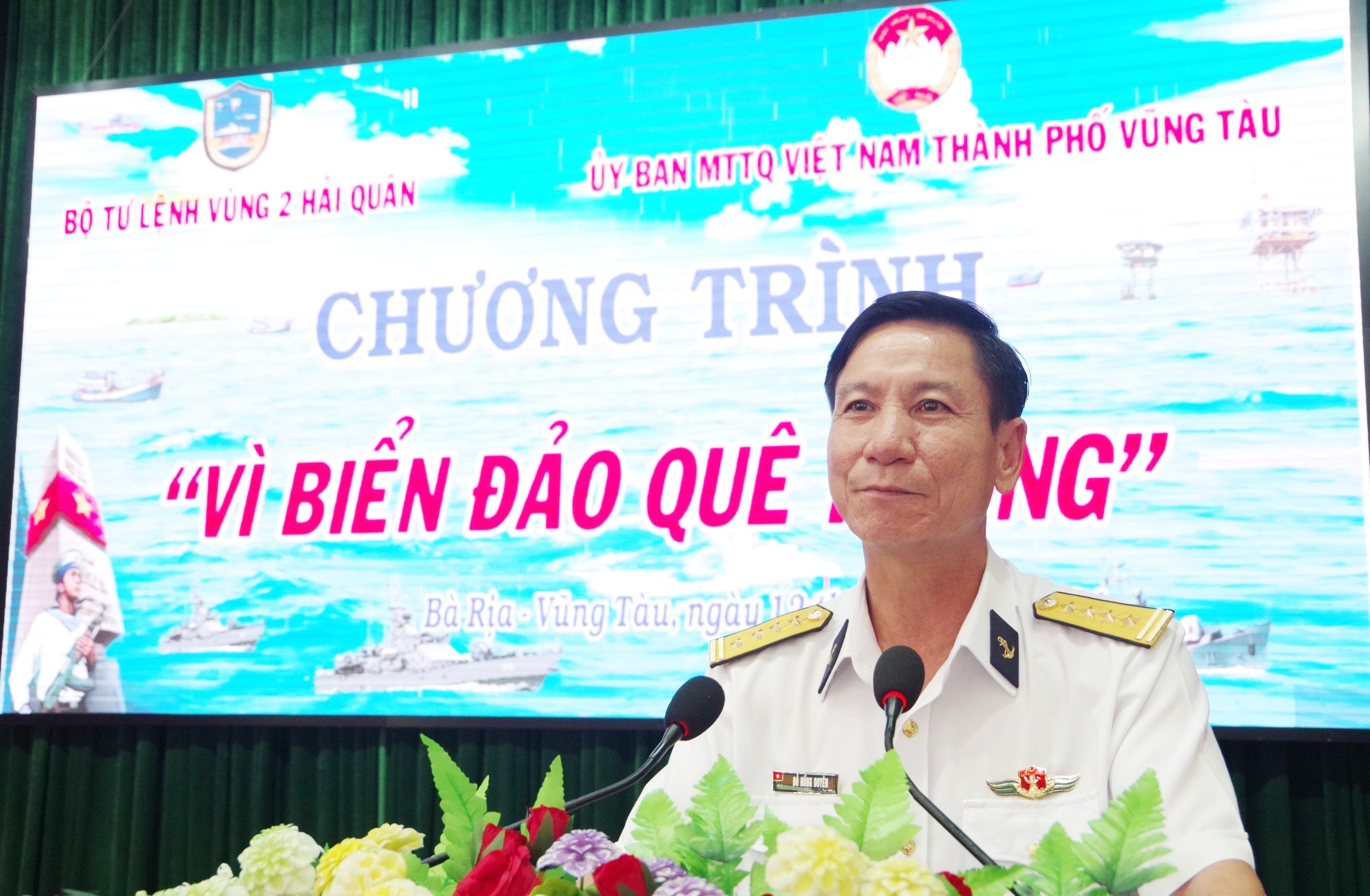 Sáng 12/7, tại TP. Vũng Tàu, tỉnh Bà Rịa - Vũng Tàu, đoàn đại biểu lãnh đạo Thành ủy, HĐND, Ủy ban MTTQ Việt Nam thành phố Vũng Tàu đã tổ chức chương trình giao lưu “Vì biển, đảo quê hương” với cán bộ, chiến sĩ Vùng 2 Hải quân. Đại tá Đỗ Hồng Duyên, Phó Chính ủy và Đại tá Phạm Quyết Tiến, Phó Tư lệnh Vùng 2 chủ trì tiếp đoàn.
