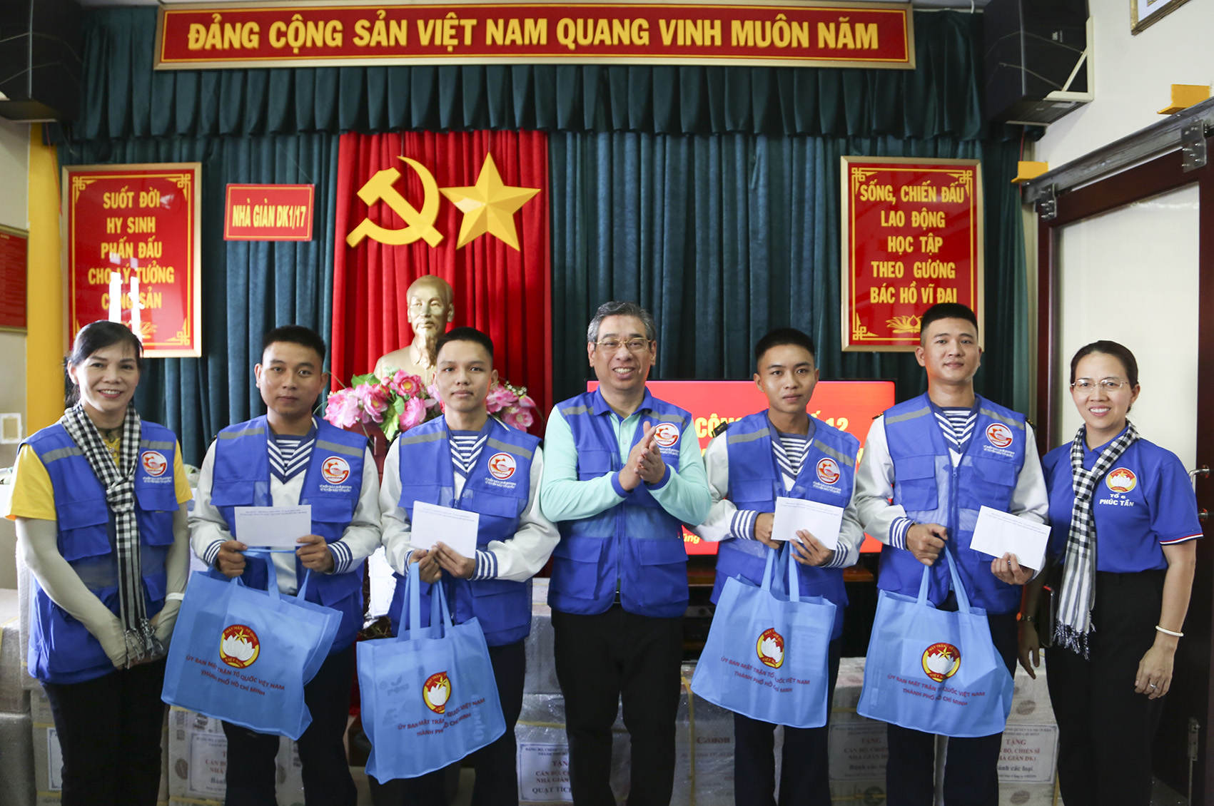 Đồng chí Nguyễn Phước Lộc và đại biểu TP. Hồ Chí Minh tặng quà các chiến sĩ đang công tác tại Nhà giàn DK1/17